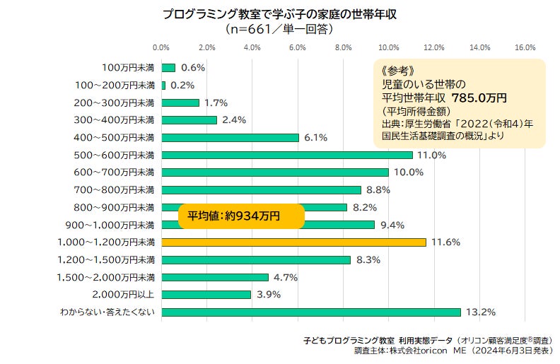 つづいて、子どもプログラミング教室に通っている(いた)子どもの家庭の「世帯年収」について聴取したところ、「わからない・答えたくない」を除いて、「1,000~1,200万円未満」が11.6%で最も多く、平均世帯年収は「約934万円(※)」となりました。比較参考として、厚生労働省の「2022(令和4)年 国民生活基礎調査の概況」によると、児童のいる世帯の平均世帯年収は「785万円」であることから、プログラミング教室に通っている(いた)子どもの家庭の世帯年収は、日本の児童のいる世帯の平均よりも高めであることが伺えます。