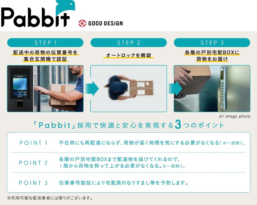 大規模マンション初※2。留守中でも各階住戸専用の宅配BOXで受け取りが可能な「Pabbit」を採用。入居者の「宅配ストレス」を軽減すると同時に、再配達削減によるCO2排出量の削減でSDGsにも貢献。
