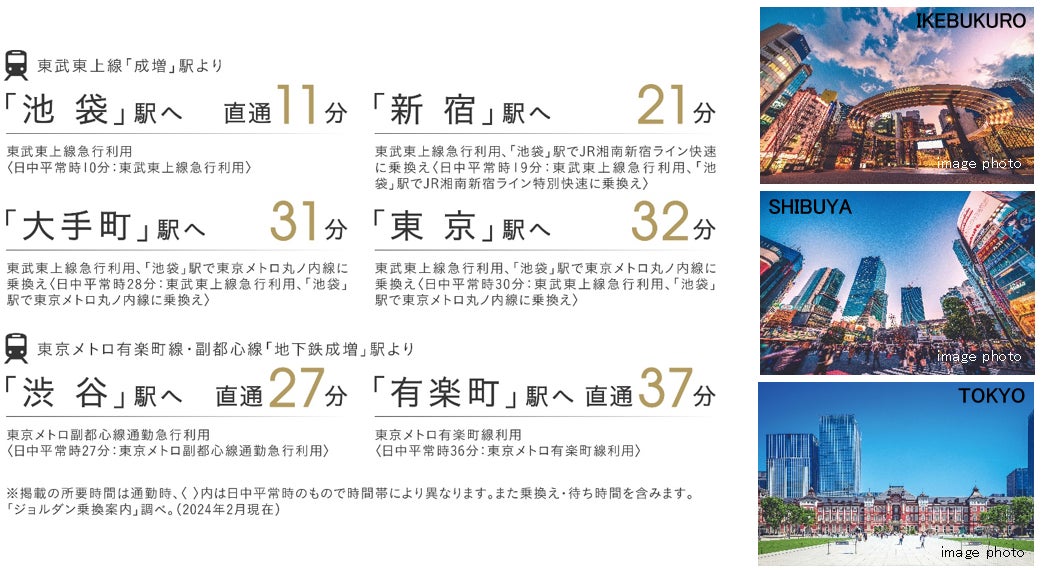 徒歩10分の東京メトロ有楽町線・副都心線「地下鉄成増」駅を最寄りに、東武東上線「成増」駅、東武東上線・東京メトロ有楽町線・副都心線「和光市」駅の3駅3路線が利用可能。都心主要駅へのスマートアクセスが、通勤・通学や、休日のお出かけに便利です。