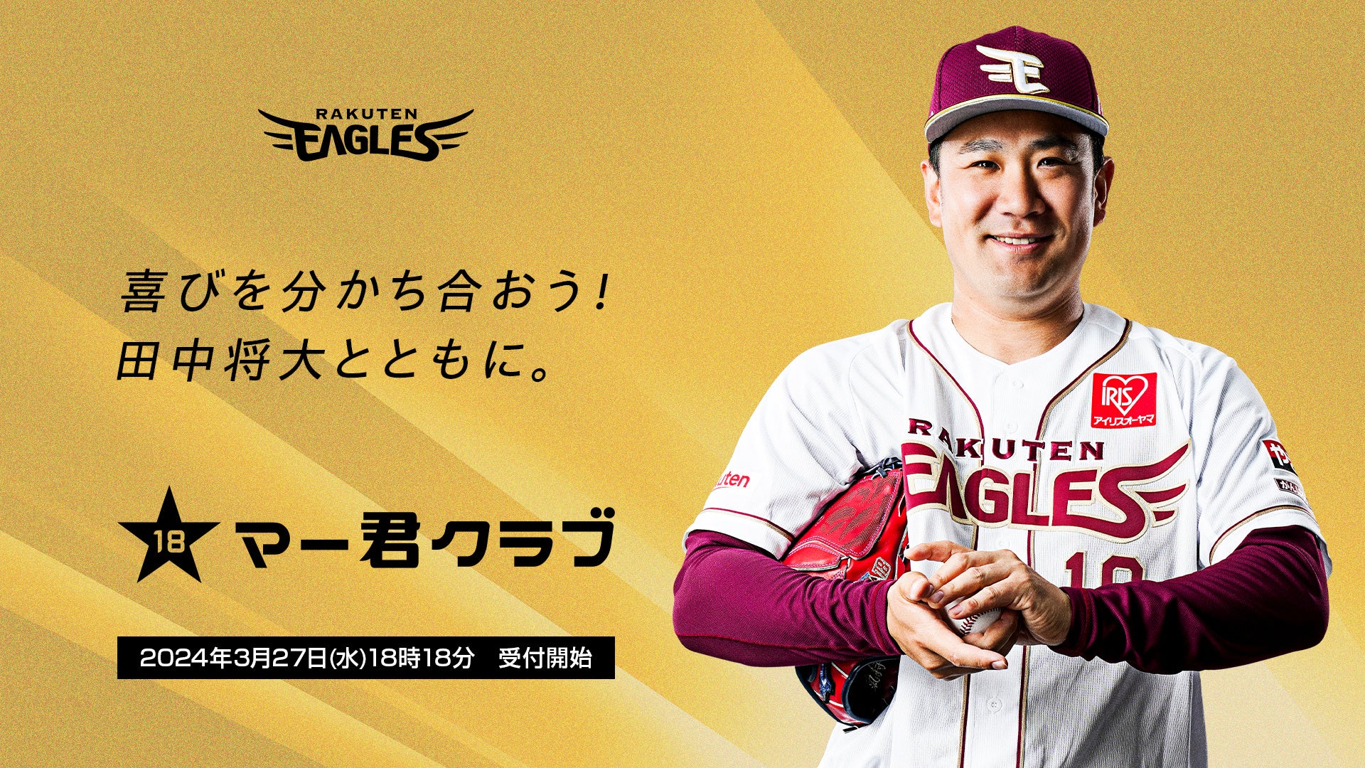 株式会社楽天野球団(本社:宮城県仙台市宮城野区、代表取締役社長:森井 誠之)は、田中 将大選手個人のファンクラブである「マー君クラブ」2024シーズンの入会受付を、3月27日(水)の背番号18にちなんだ18時18分より開始することとなりましたのでお知らせいたします。
