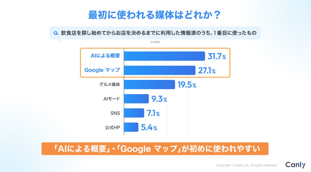 最新の調査で「飲食店を探し始めてからお店を決めるまでに、1番目に使った情報源」を伺ったところ、従来の検索方法に加えて、新たなAI検索機能が上位に食い込んでいるという結果が出ました。