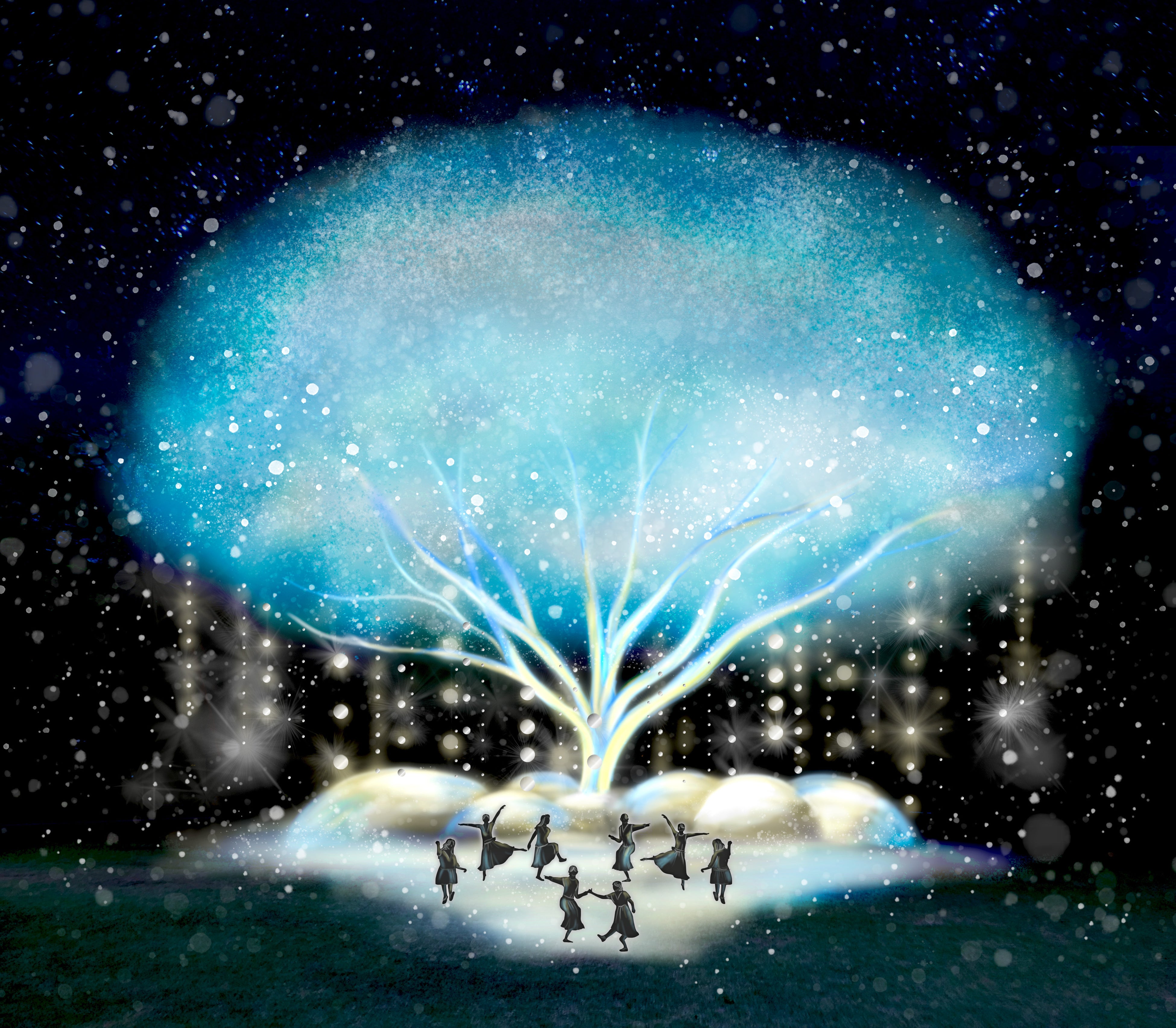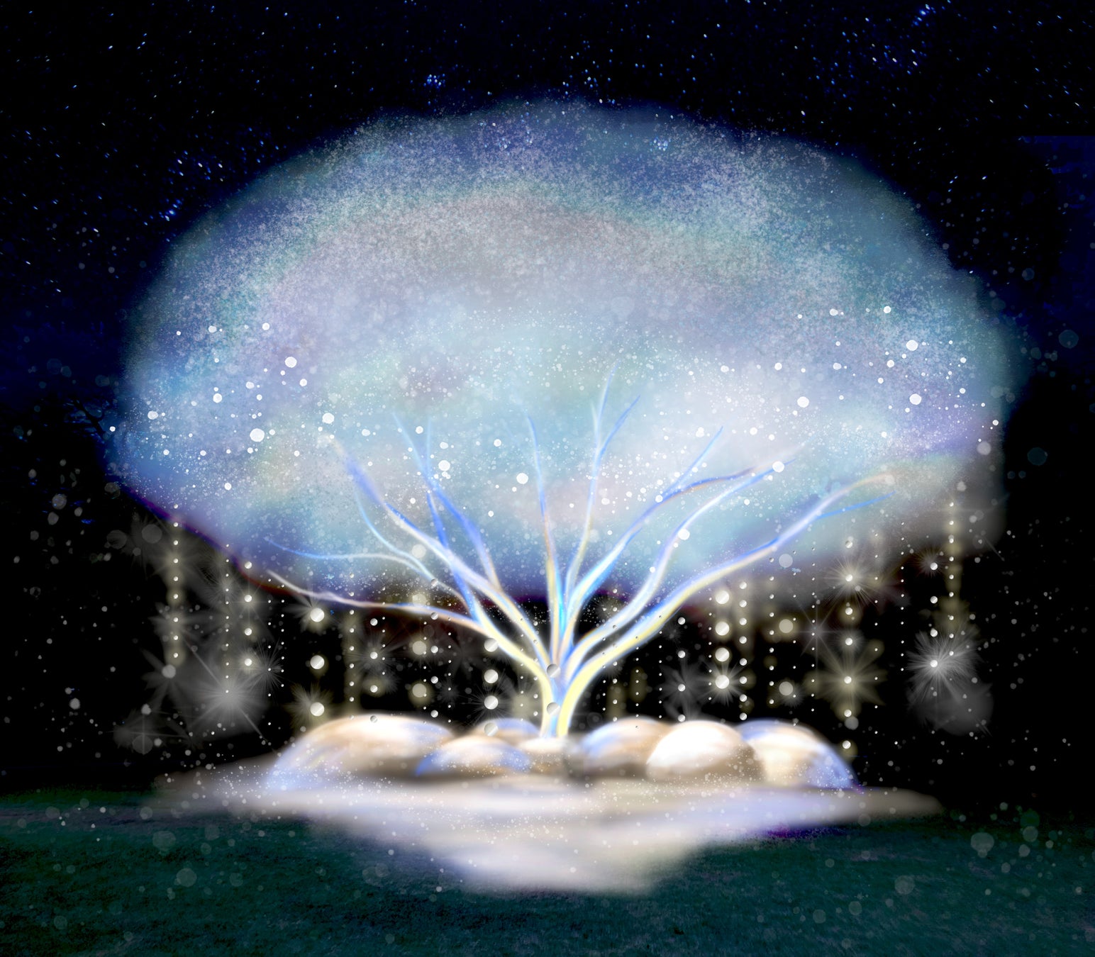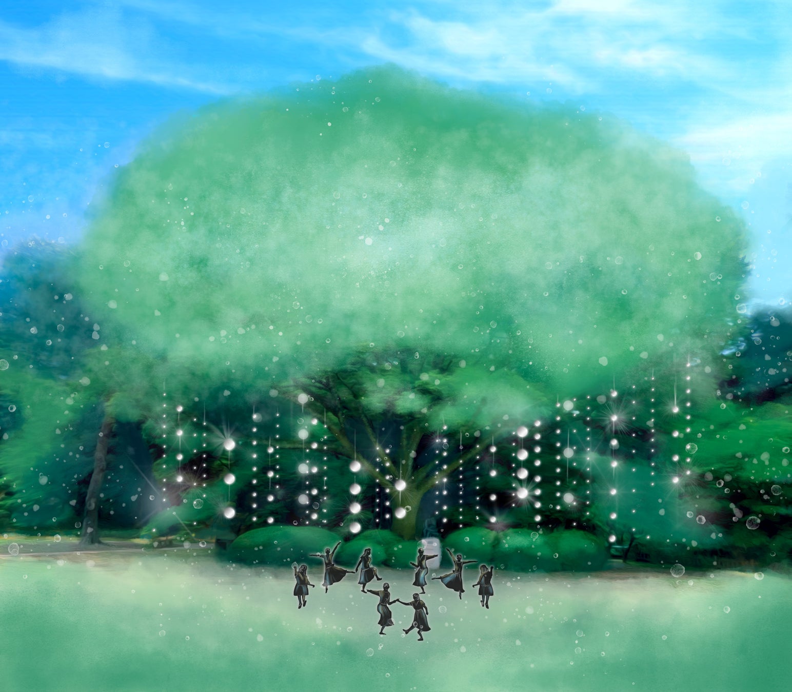 朝香宮邸が建つずっと以前からこの地を見守ってきたオオエノキ、それに寄り添うように並び立つムクノキは、芝庭のシンボルツリーです。その木を祝宴の紙吹雪のように光に輝くモビールで飾り付け、40周年のお祝いの大樹にします。夜にはプロジェクションマッピングで映像を投影し、大樹の精霊が私たちに問いかけてくるような、幻想的な光の調べがくりひろげられます。