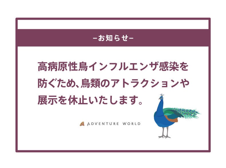 アドベンチャーワールド(和歌⼭県⽩浜町)では、⽇本国内での⾼病原性⿃インフルエンザの発⽣状況を受けて2022年11⽉4日(金)より、飼育⿃類を疾病から守るために以下の対策を講じることを決定いたしましたのでお知らせいたします。