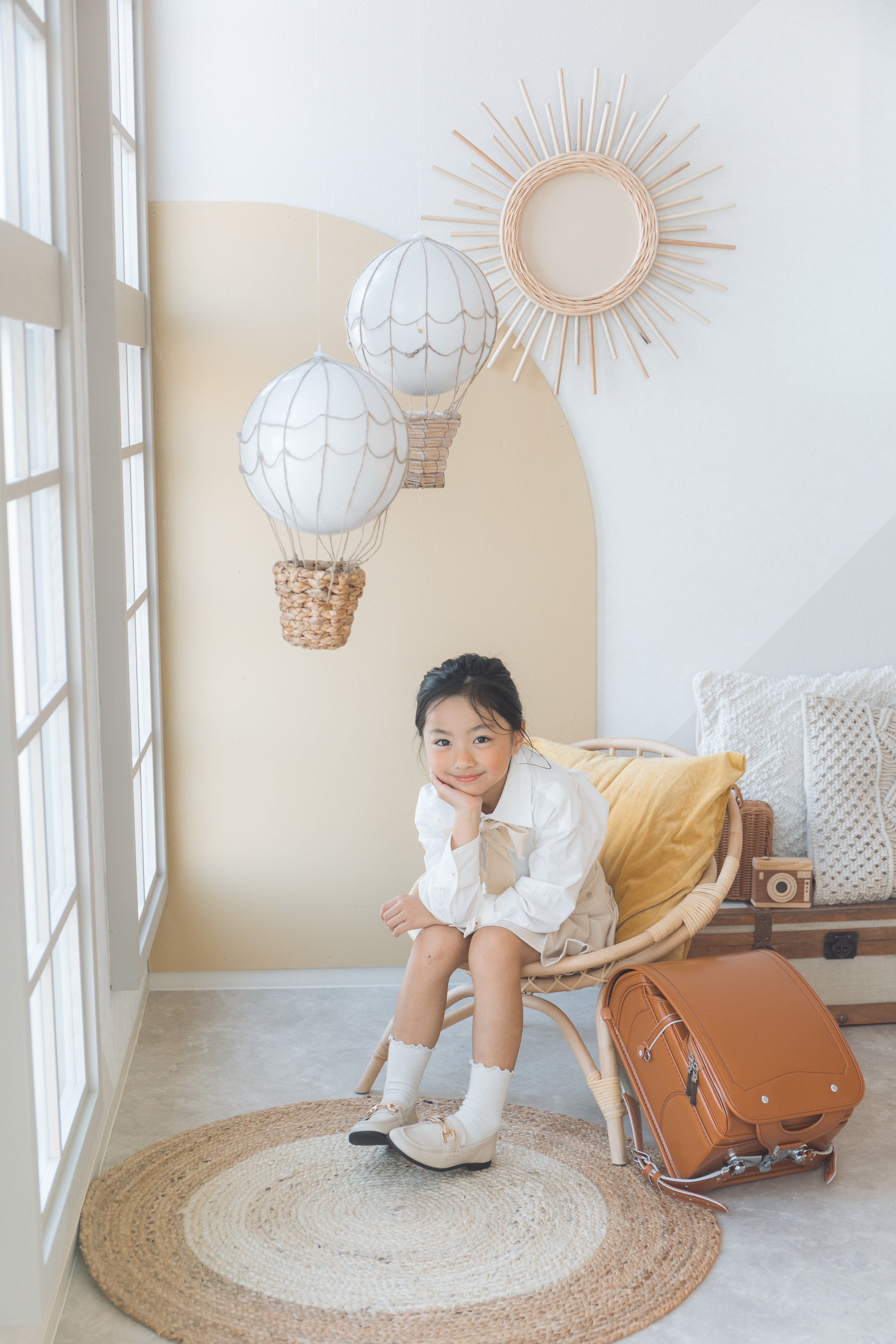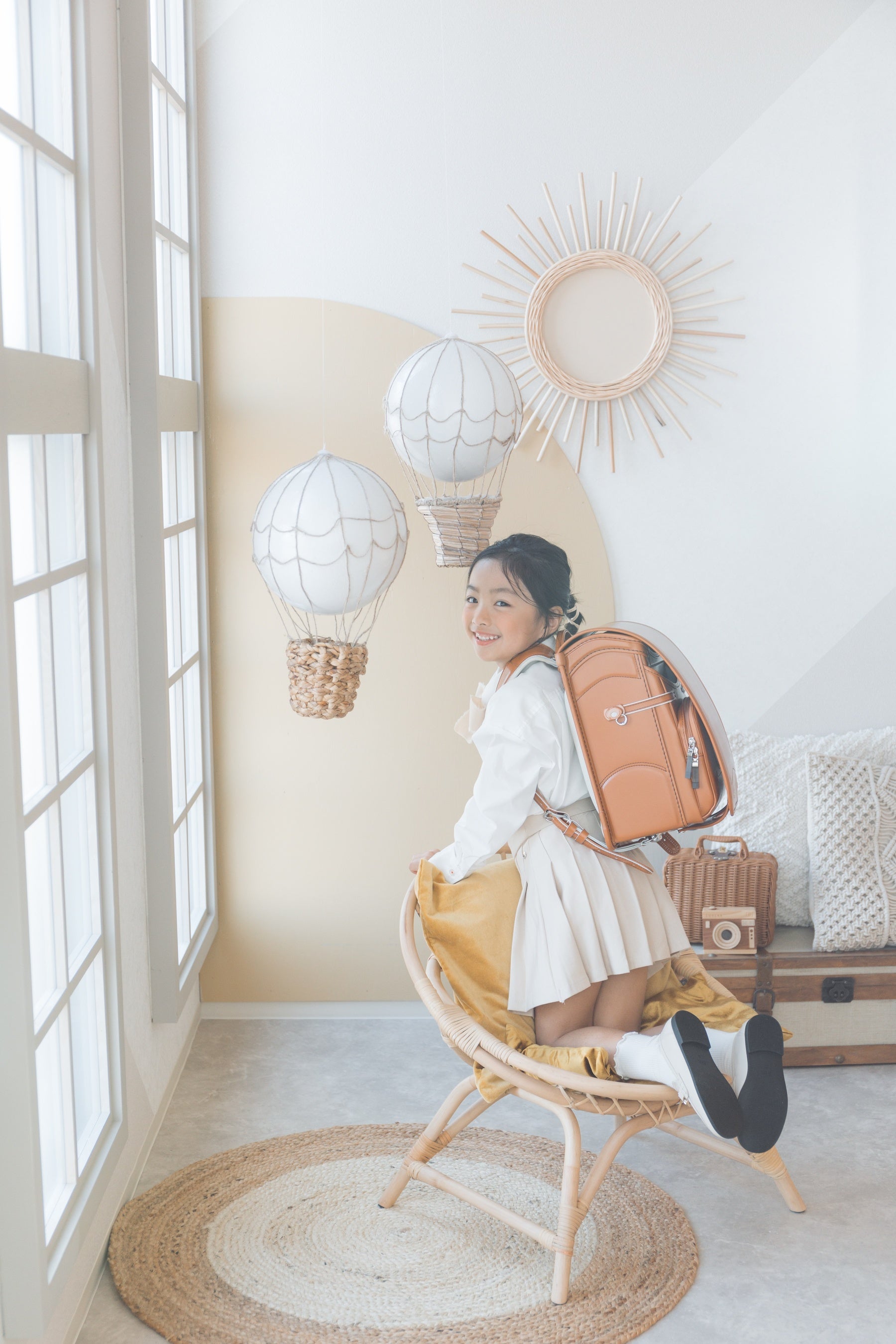 衣装やランドセルはスタジオの色合いに合わせて素朴だけどトレンド感もあるスタイルを意識しました