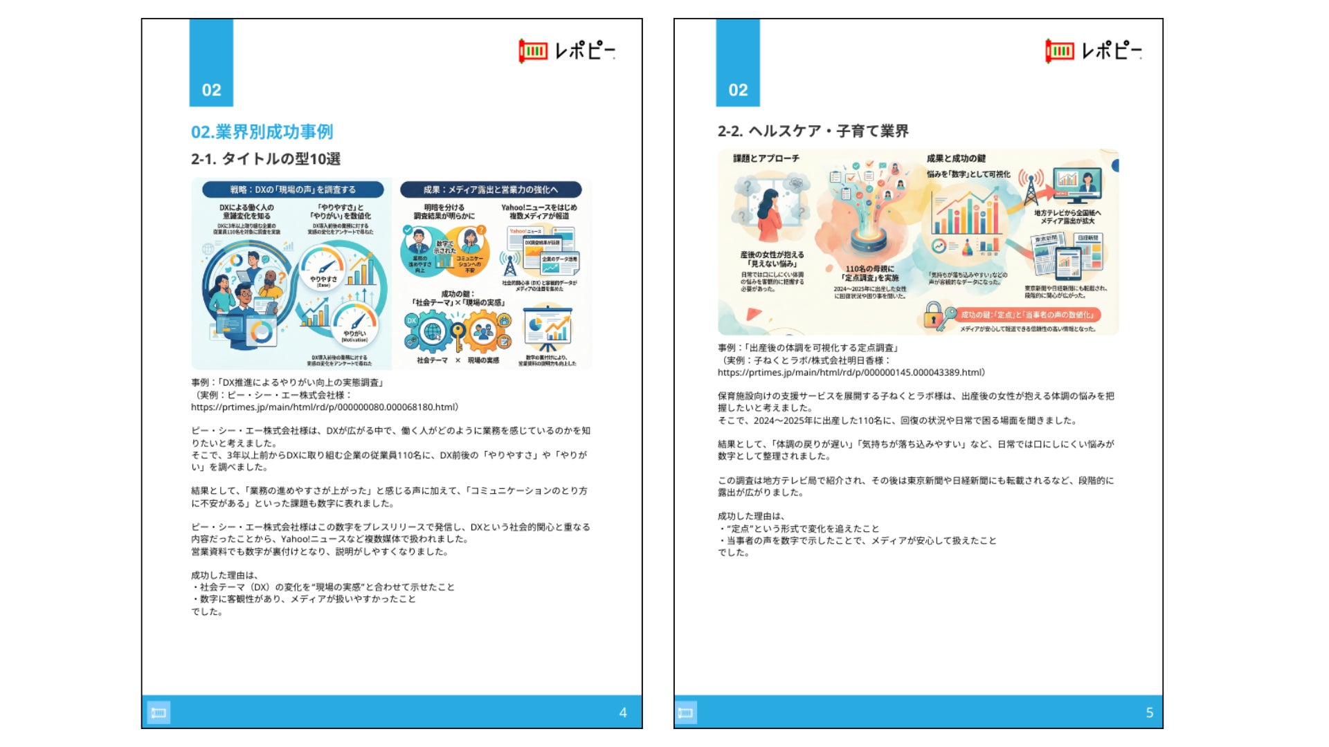IT・DX業界やヘルスケア・子育て業界の実例を取り上げています。Yahoo!ニュースなど複数媒体で取り上げられた調査や、地方テレビから全国紙へと露出した事例などをまとめています。
