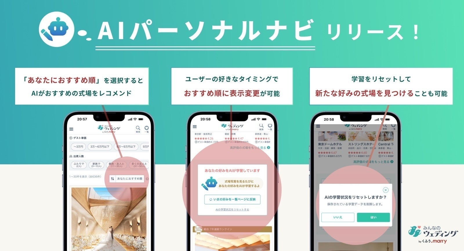 【みんなのウェディング】AIがユーザーの好みに合った結婚式場を優先的に表示させる「AIパーソナルナビ」を提供開始