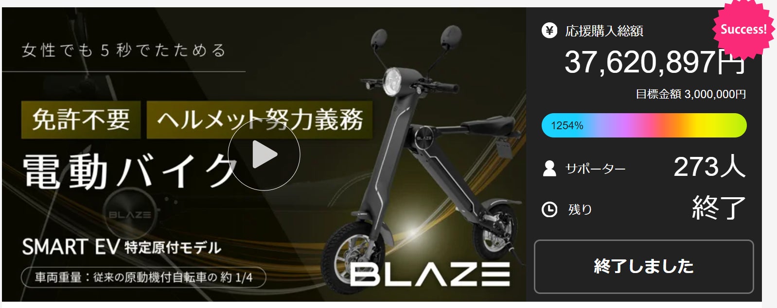 先行販売として、2024年8月20日から11月2日まで、大手クラウドファンディングサイトのMakuakeにて実施した「スマートEV特定原付モデル」販売プロジェクトは、結果として、応援購入総額を3,700万円を突破し終了いたしました。