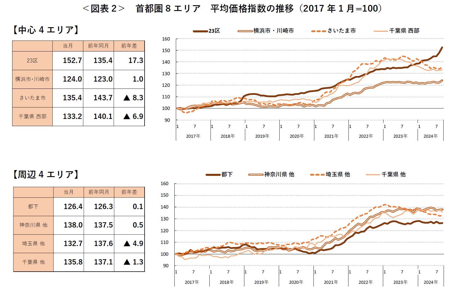 エリア別の前年同月比は、東京都、神奈川県の4エリアが上昇した一方、埼玉県、千葉県の4エリアは下落した。中でも埼玉県他は13カ月連続、千葉県他は72カ月ぶりの下落となっている。