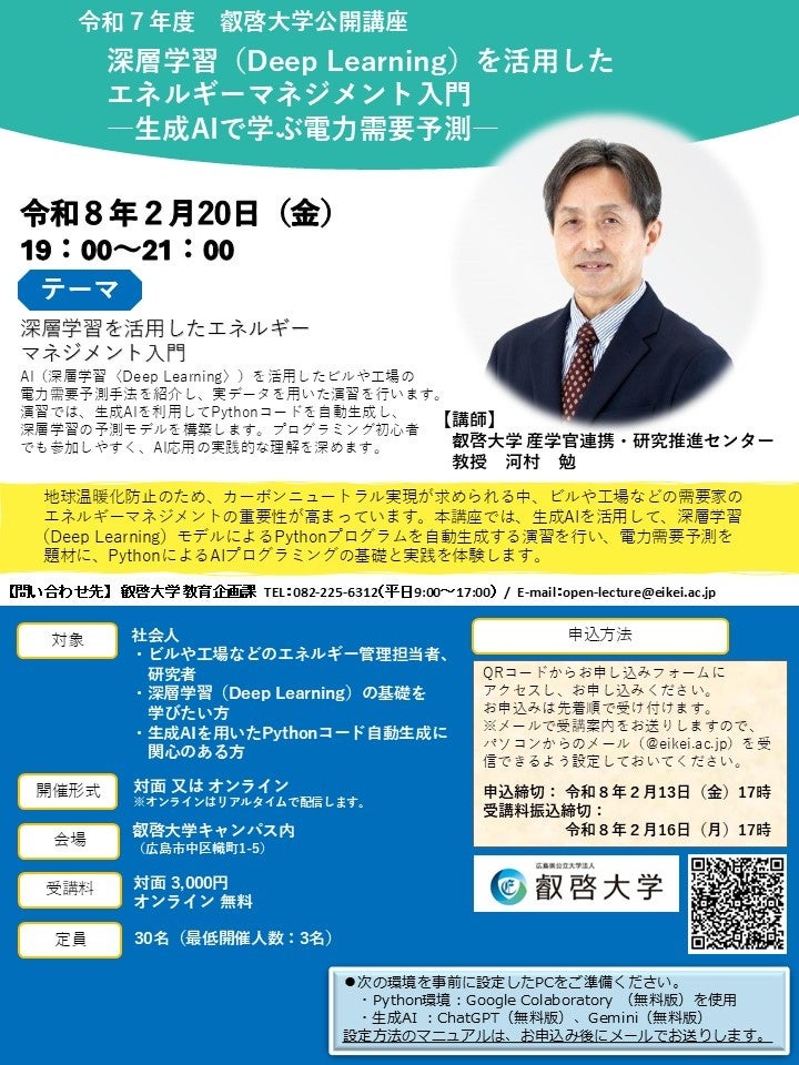 【受講者募集】2025年度公開講座 深層学習(Deep Learning)を活用したエネルギーマネジメント入門 - 【公式サイト】広島県公立大学法人 叡啓大学