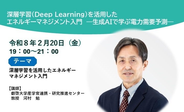 叡啓大学(学長:有信睦弘、広島市中区)は、「深層学習(Deep Learning)を活用したエネルギーマネジメント入門―生成AIで学ぶ電力需要予測―」と題して、公開講座を開催します。カーボンニュートラルの実現に向け、ビルや工場などで電力を無駄なく使う「エネルギーマネジメント」の重要性が高まっています。本講座では、エネルギー管理に携わる方だけでなく、AI活用に関心のある一般の社会人の方も対象に、生成AIを使って電力需要(電力消費量)を予測する仕組みを分かりやすく解説します。