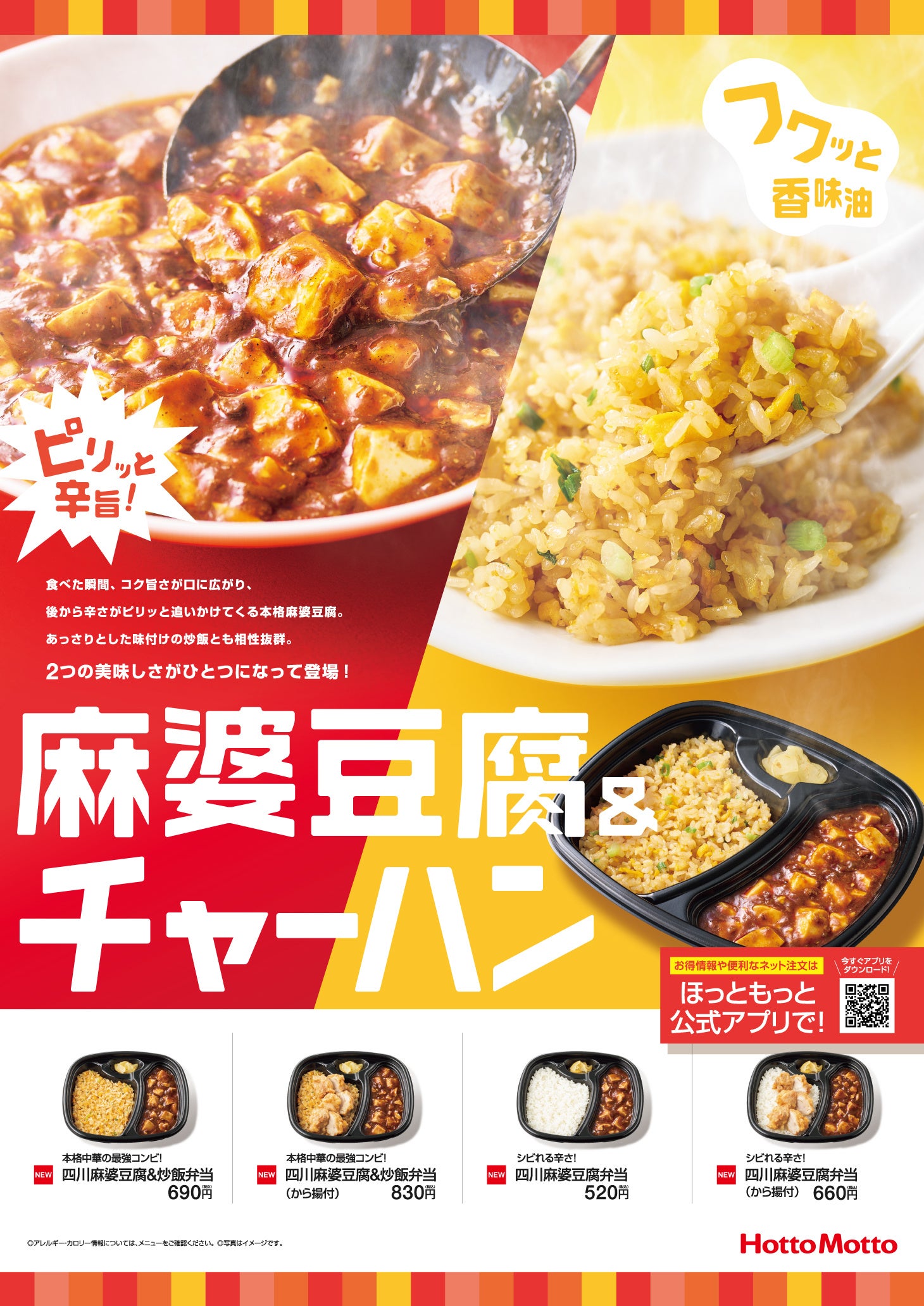 このたび「ほっともっと」では、中華料理の定番2商品「麻婆豆腐」と「炒飯」が一つになった夢の商品『四川麻婆豆腐&炒飯弁当』690円を2月21日(水)より新発売いたします。また、から揚トッピングや炒飯を白ごはんに変更することも可能です。