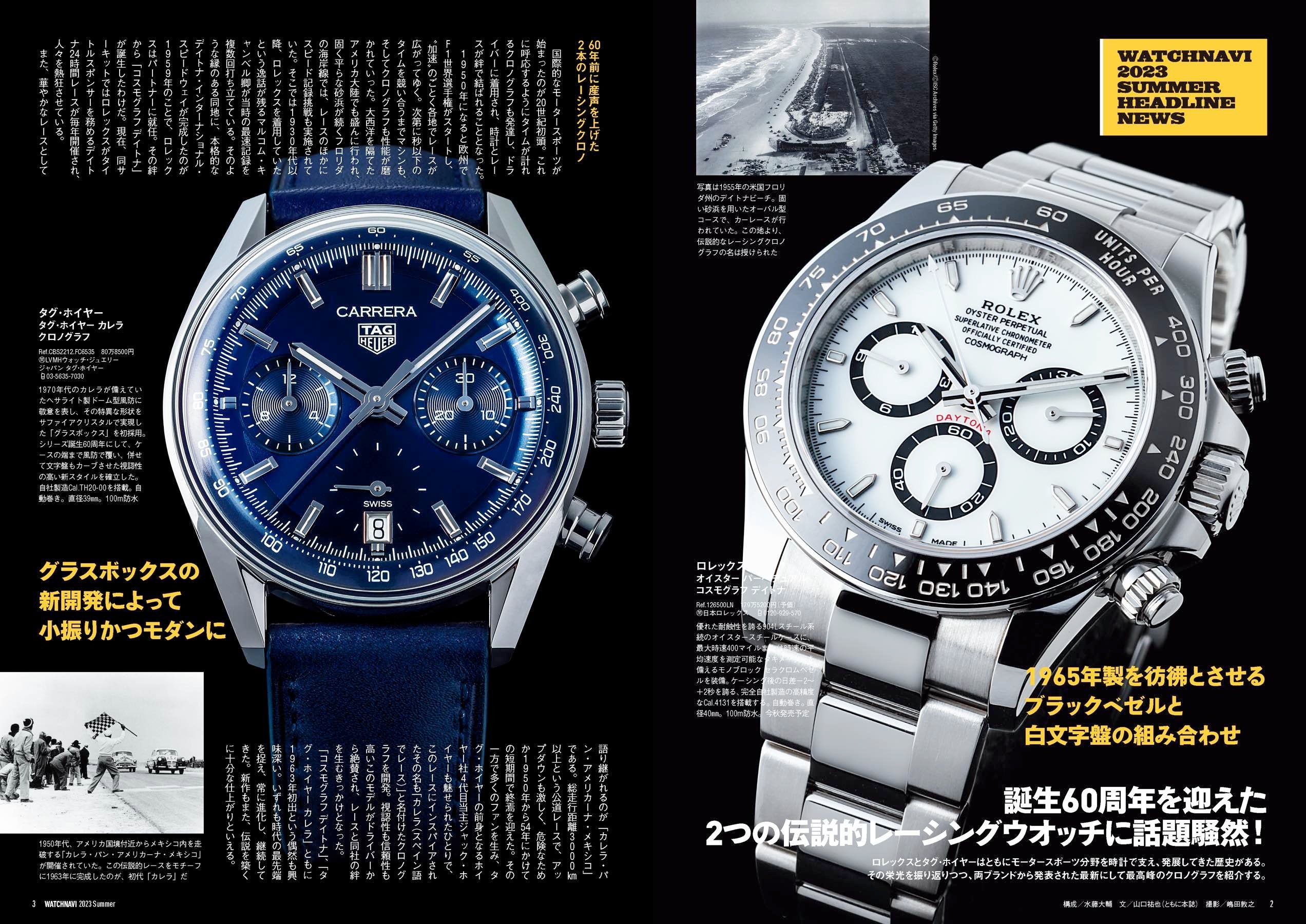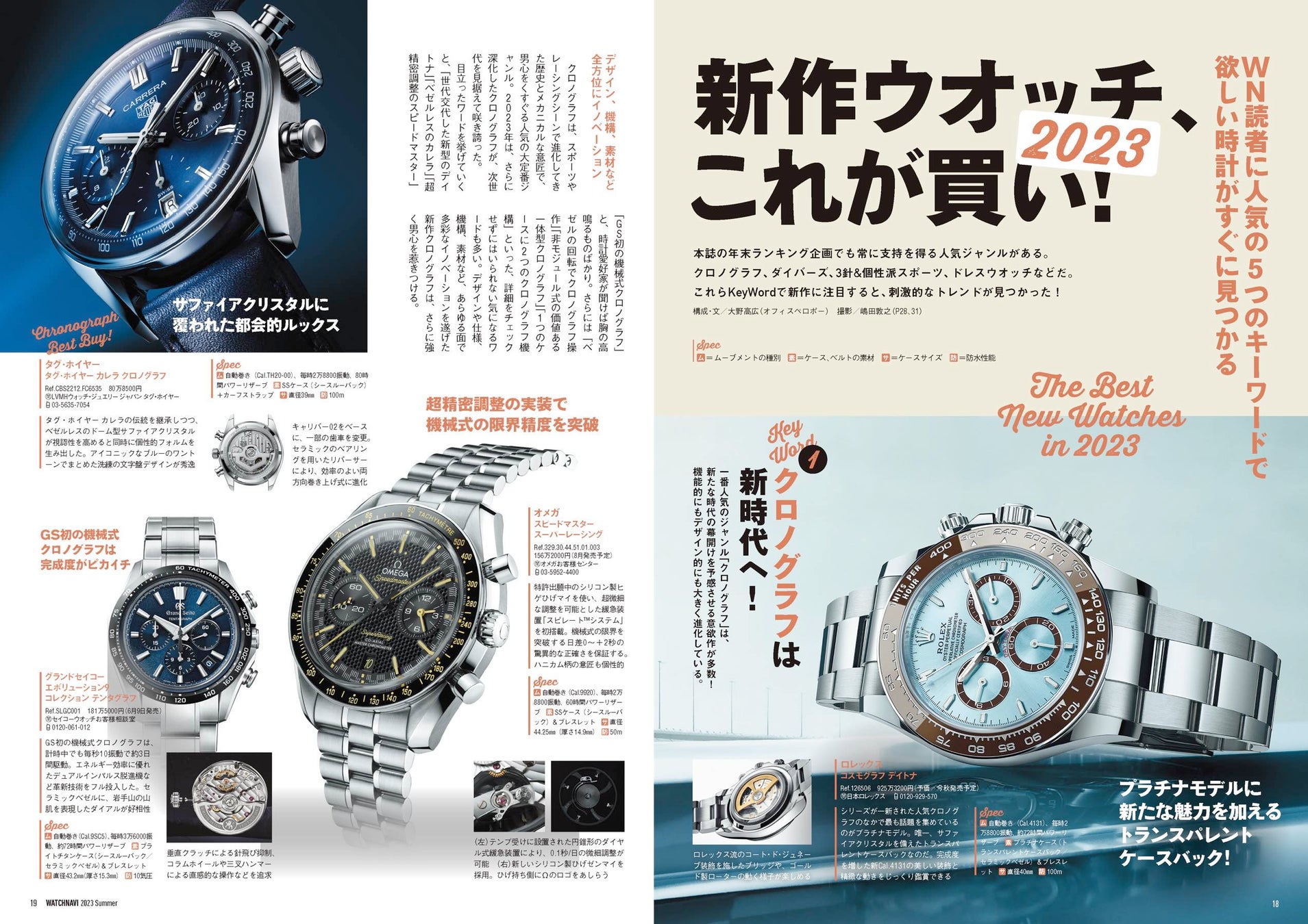 誕生60周年を迎えるタグ・ホイヤー カレラ最新作の表紙が示す通り、今号は新作ウオッチを大特集! 別冊付録はジュネーブで開かれた時計ショー「WAWTCHES & WONDERS GENEVA」発表モデルを中心に、現地取材での豊富な撮り下ろし写真とともに64ページにわたり83ブランドの新作を300本以上取り上げています。