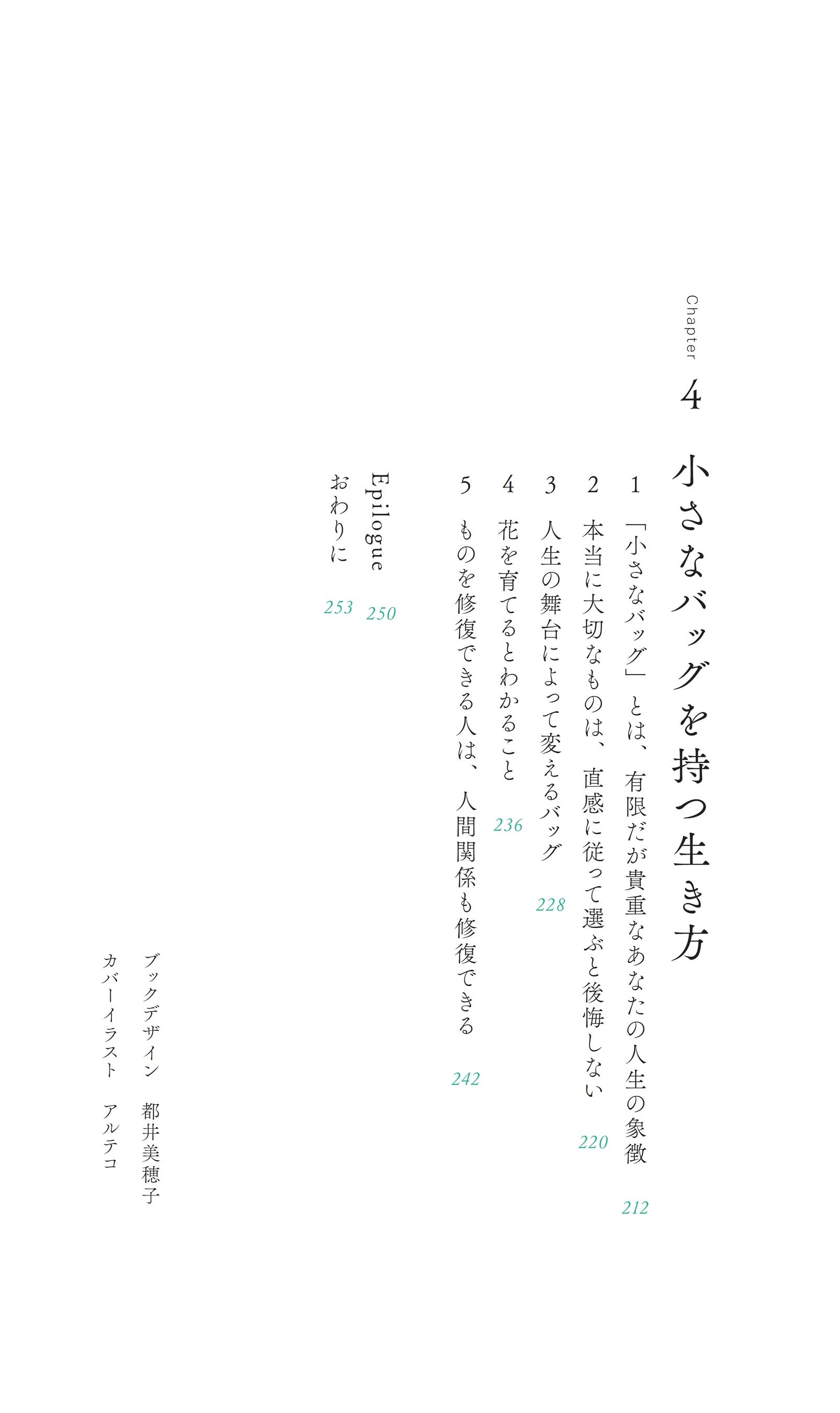 小さいバッグは「有限なあなたの人生」の象徴。一人ですべてのものを持つことはできません。だからこそ、何を入れるのか慎重に精査する必要があるのです。本書では、小さなバッグを持つという行為を通じて、人生に本当に必要なものとは何か、見つめ直します。