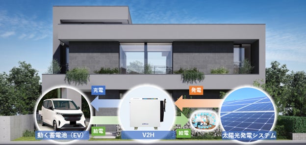 EVには大容量の蓄電池が搭載。V2Hと接続することで、その電力を家庭でも有効活用