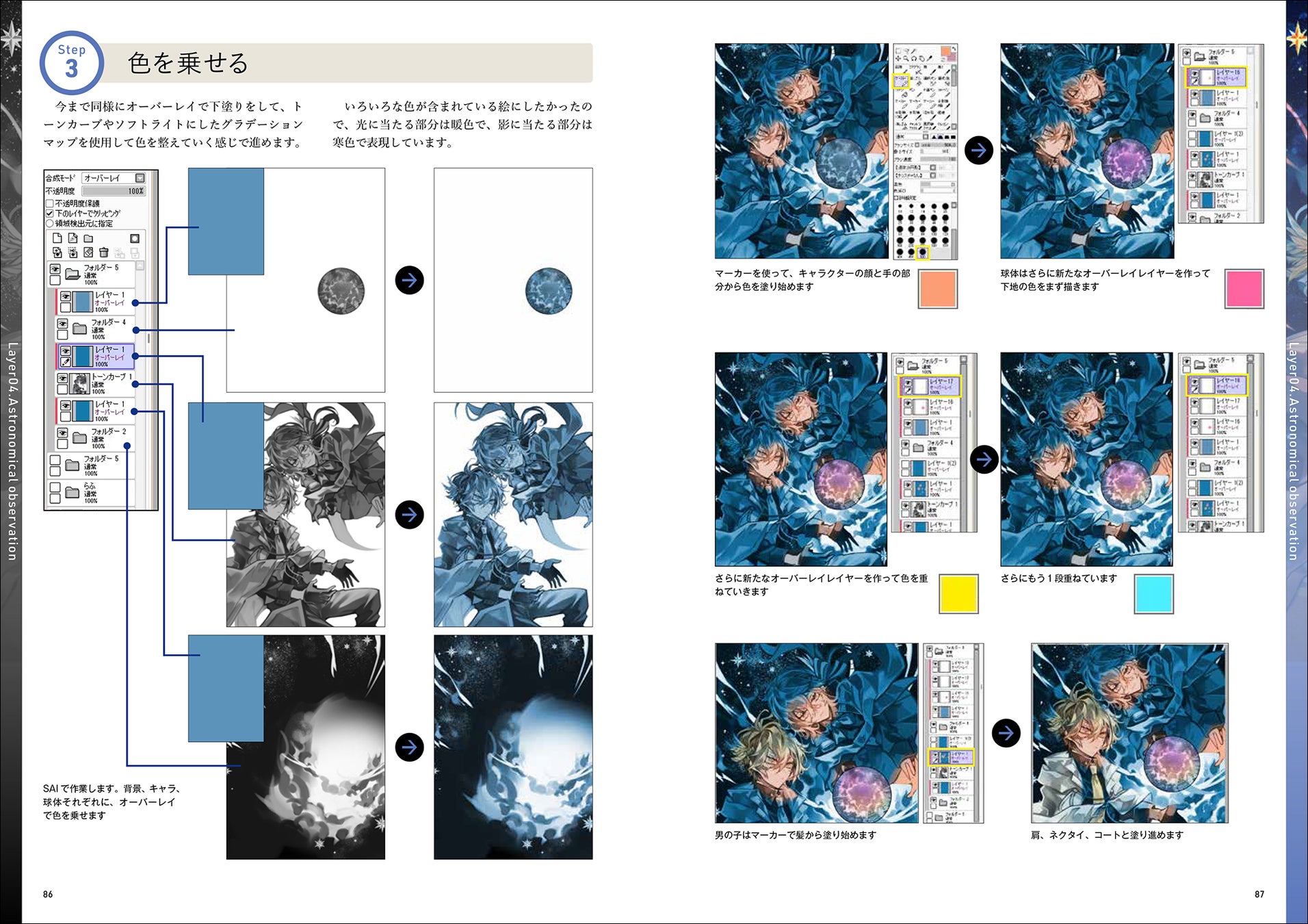 色を塗るときに大変なのが「どの色がいいのか」「光や影の色はどうするのか」「色味の反射も考えなきゃ」と、様々な色の影響も考えて塗らなければいけません。そして、色を変えたいなと思ったとき、他にもあちこち影響が出てきて大変だったり…。これを解決するのがグリザイユ画法。モノクロで陰影を塗っておき、上から色のレイヤーを重ねるだけで、難しいことを一切考えずに色が塗れ、色の変更も簡単です! このほか、グリザイユ画法では弱いと言われる、鮮やかな色合いにする手法も公開。
