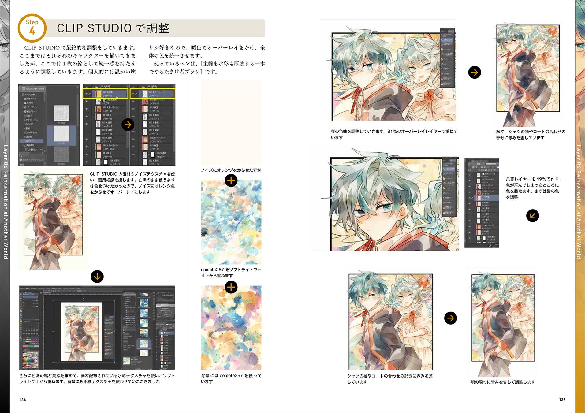 厚塗り、グラデ塗り、水彩風、アニメ風、ポスタリゼーション風、ハイコントラスト風など、さまざまな塗り方をグリザイユ画法で行う方法も詳細に解説しています。