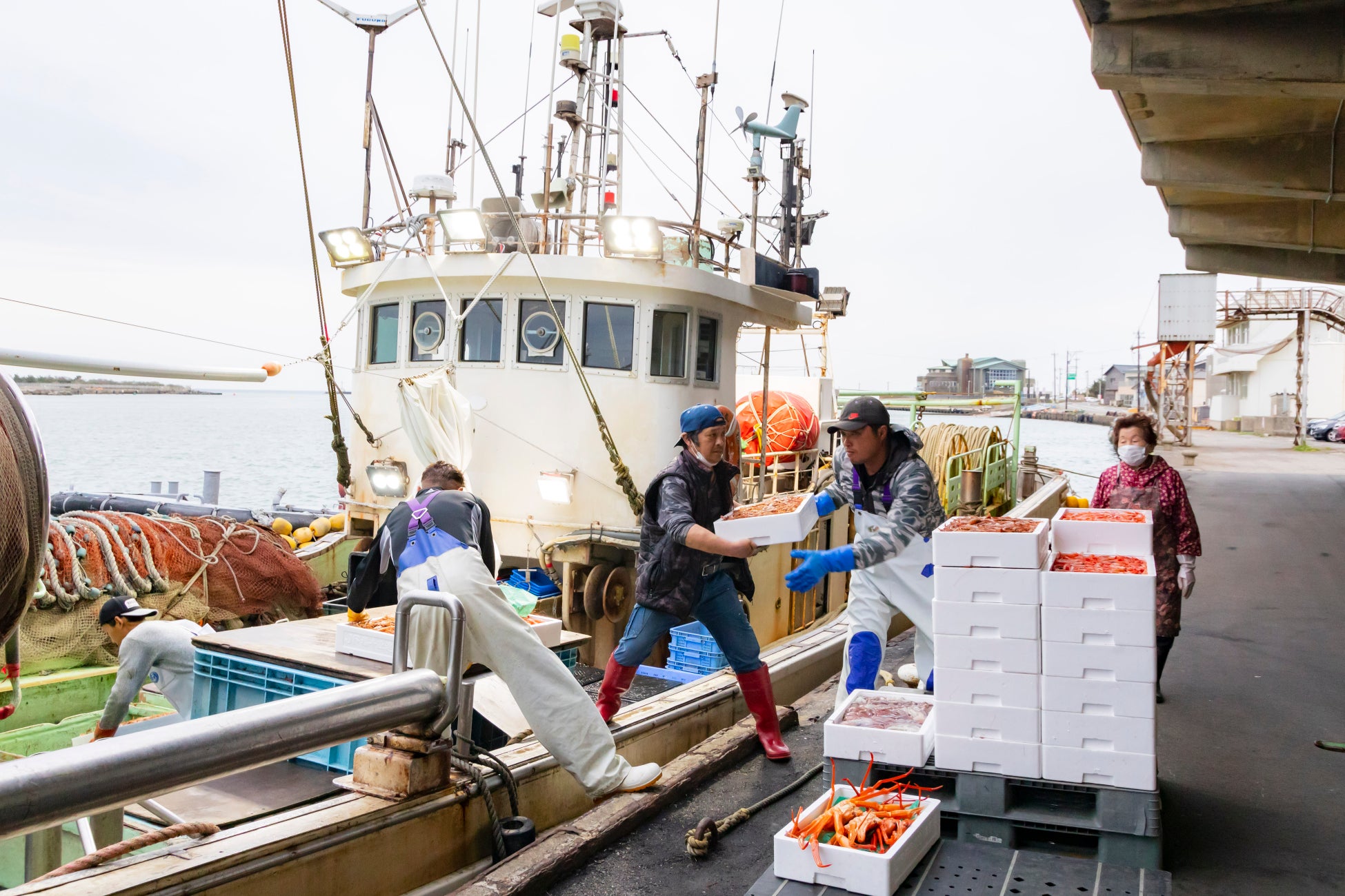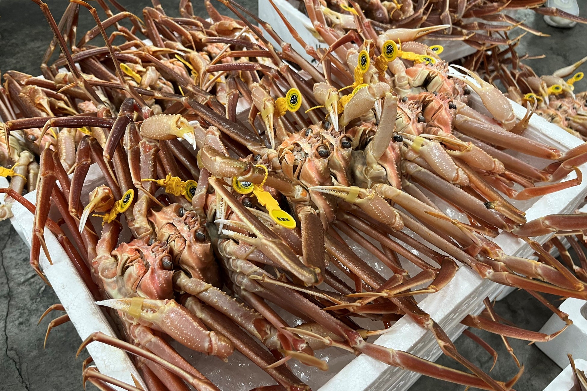 福井県の三国港・越前港・敦賀港・小浜港で水揚げされるズワイガニを「越前がに」と呼びます。その歴史は古事記まで溯り、安土桃山時代にはすでに「越前蟹」の表記が見られます。中でも三国港に水揚げされる越前がには、日本で唯一1922年から皇室献上が許されています。水揚げ港で取り付けられる黄色いタグは、歴史ある「越前がに」を守り続ける本物の証で、農林水産省が進めている「地理的表示保護制度(GI)」にも登録されています。漁期は11月6日から3月20日、また、内子が人気のメスのセイコガニは12月末までなので、食べられるのは約2か月だけです。