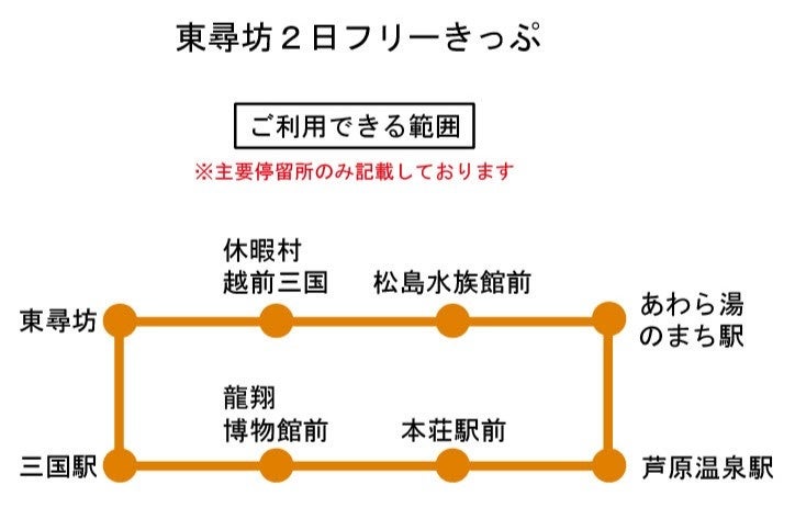 越前がにシーズンの期間中、東尋坊三国温泉加盟の9施設で、「東尋坊2日フリーきっぷ」を提示すると宿泊代のキャッシュバック(大人1,000円 小人500円)が受けられるキャンペーンを実施しています。芦原温泉駅から休暇村・東尋坊・越前松島水族館などを繋ぐ区間が2日間乗り放題のお得な切符です。