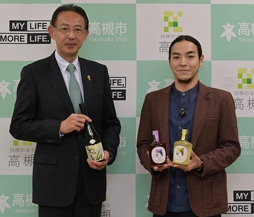令和6年11月27日(水曜日)、高槻市在住で日本初の団地酒蔵「ADACHI NOUJO Craft Sake Brewery」を経営する「足立農醸」代表の足立洋二さんが高槻市役所を訪問し、濱田剛史市長に高槻市産米を使用した新酒が完成したことを報告しました。