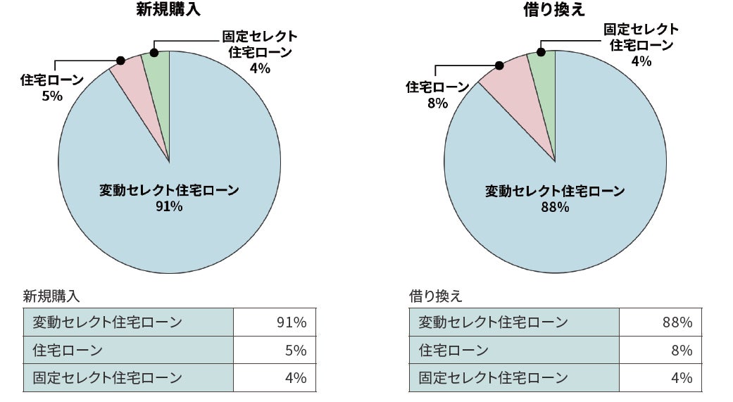 ・ 商品別では、新規購入、借り換えともに約9割が「変動セレクト住宅ローン」を選択