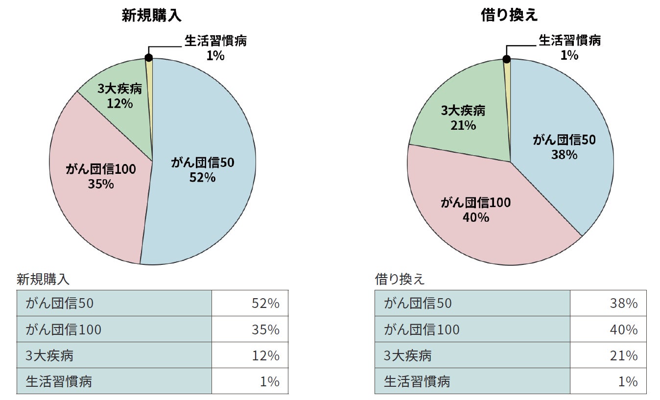 新規購入・借り換えともに、保障が手厚い団信に加入されるかたが、引き続き増加傾向にあります。金利上乗せがない「がん団信50」の人気が継続するものの、年0.1%~0.2%の金利上乗せのある、がん100%保障が付いた3種類の団信(がん団信100、3大疾病団信、生活習慣病団信)のうち、特に「がん団信100」が、前年度より4%増加しました。金利のみで比較するのではなく団信保障内容も含めたトータルコストで比較される傾向が続いています。