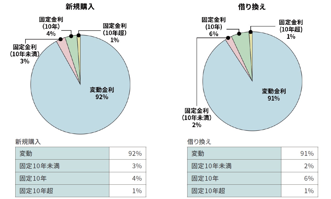 ・ 金利タイプ別では、新規購入、借り換えともに9割以上が変動金利を選択