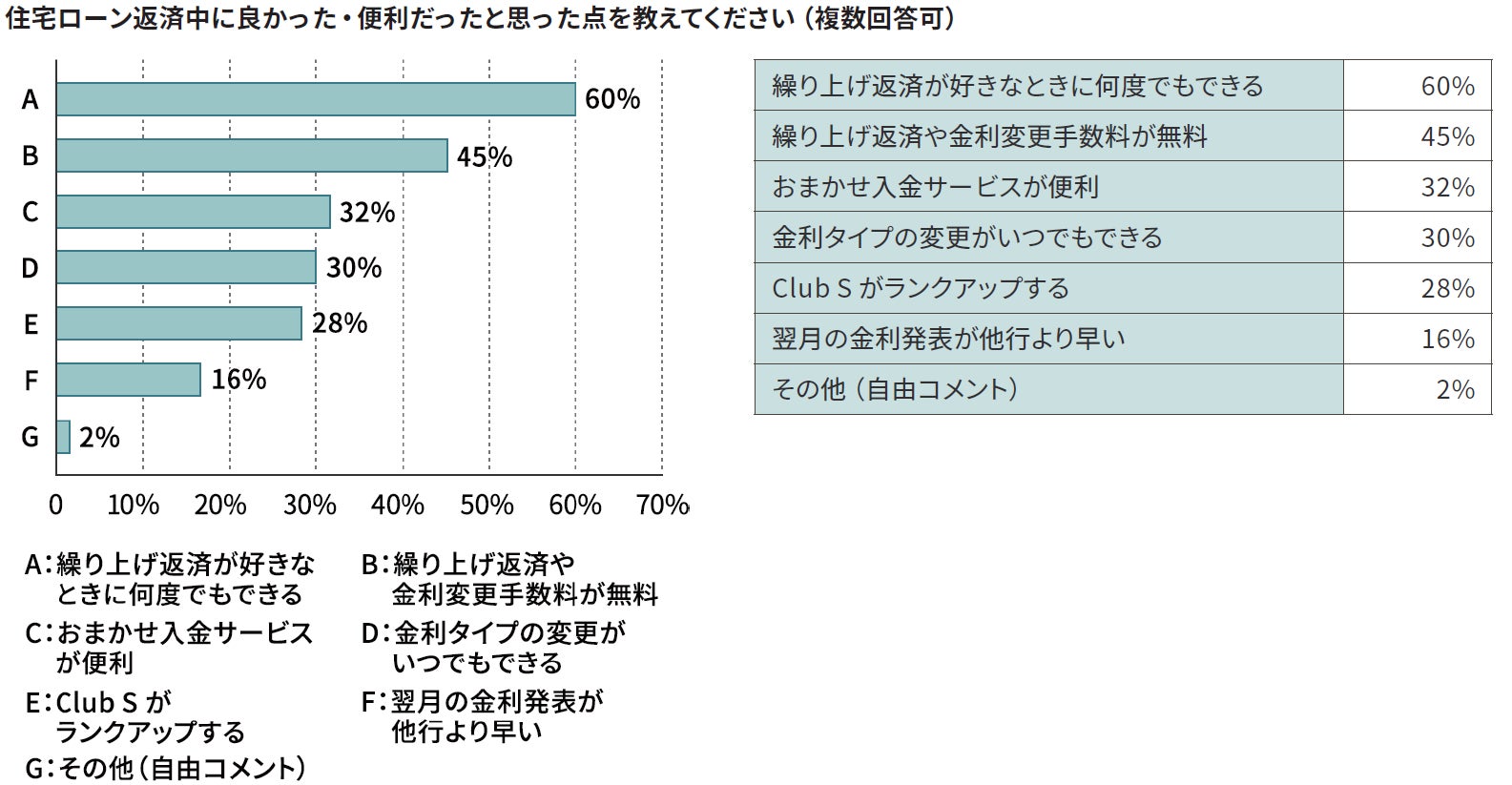 現在住宅ローンをご利用中のお客さまへ、当社を利用して良かった・便利だと思った点をお聞きしました。繰り上げ返済や金利タイプの変更が簡単な点を高評価いただいています。