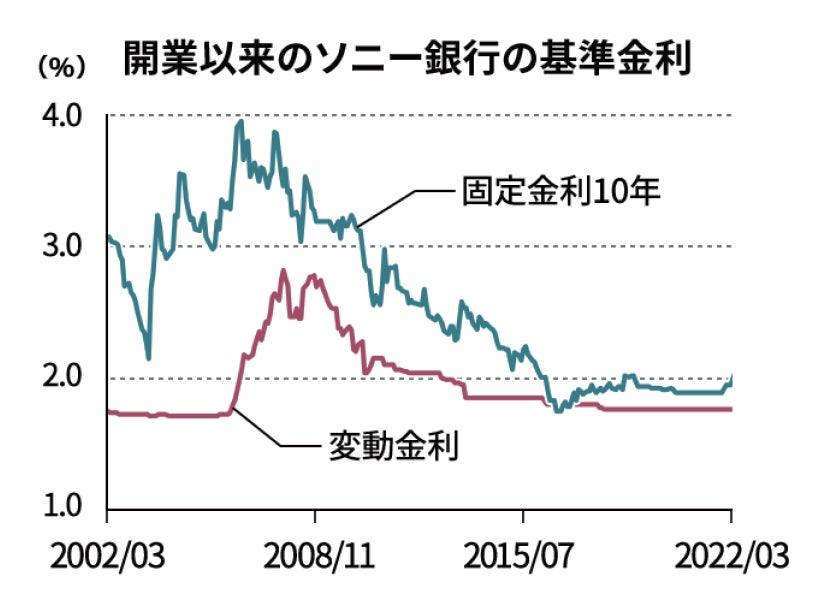 開業以来のソニー銀行の基準金利です。近年は低金利が続いていますが、今より約2%金利が高い時期もありました。実際にご利用いただく金利は、基準金利から所定の引き下げ幅が適用された金利になります。