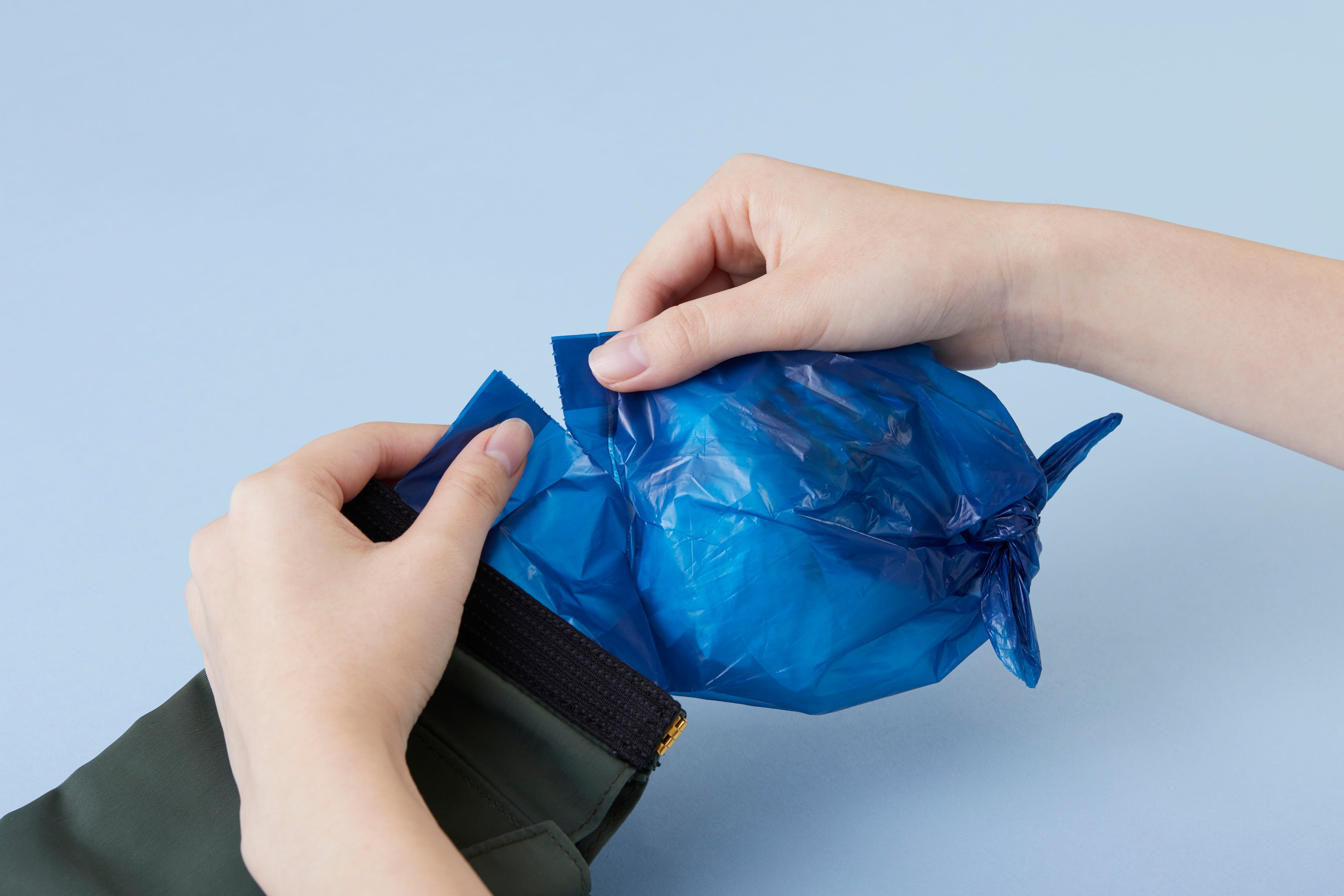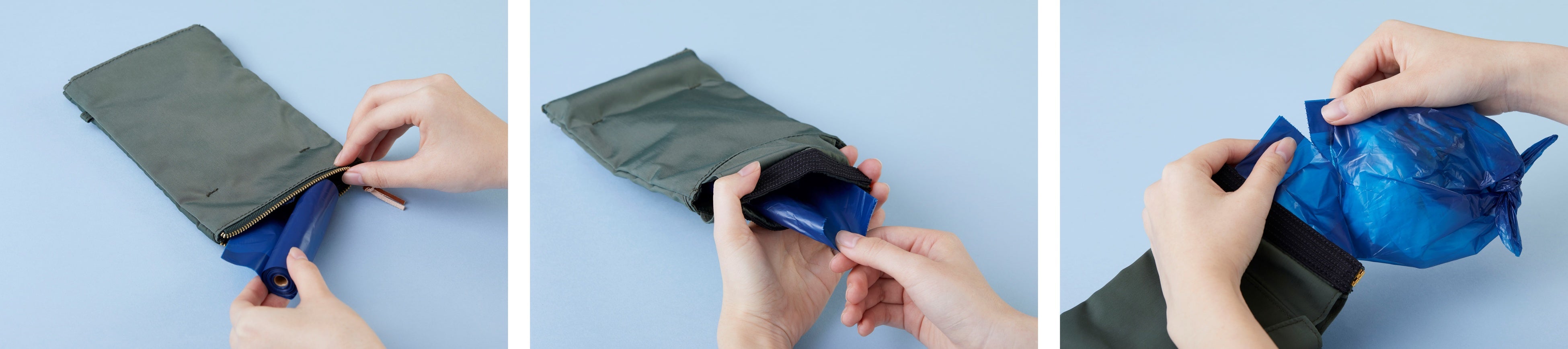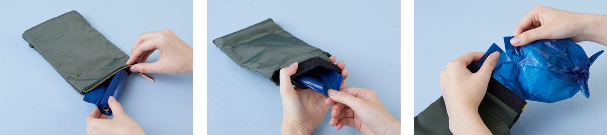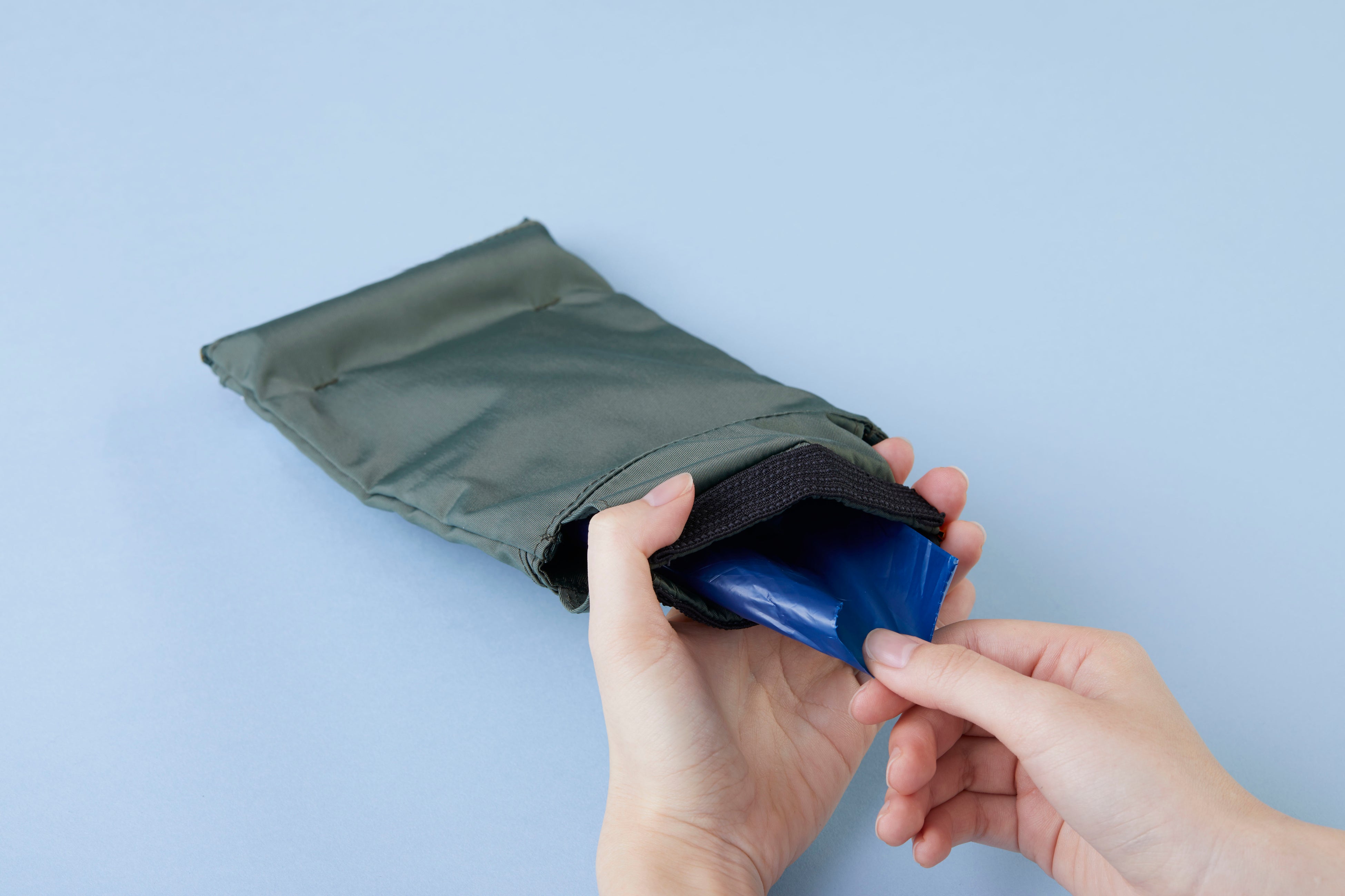 専用のごみ袋はロール状でポーチの中にセットできます。袋を都度出し入れすることなく、引き出してミシン目で切るだけで簡単に次の袋に交換できます。
