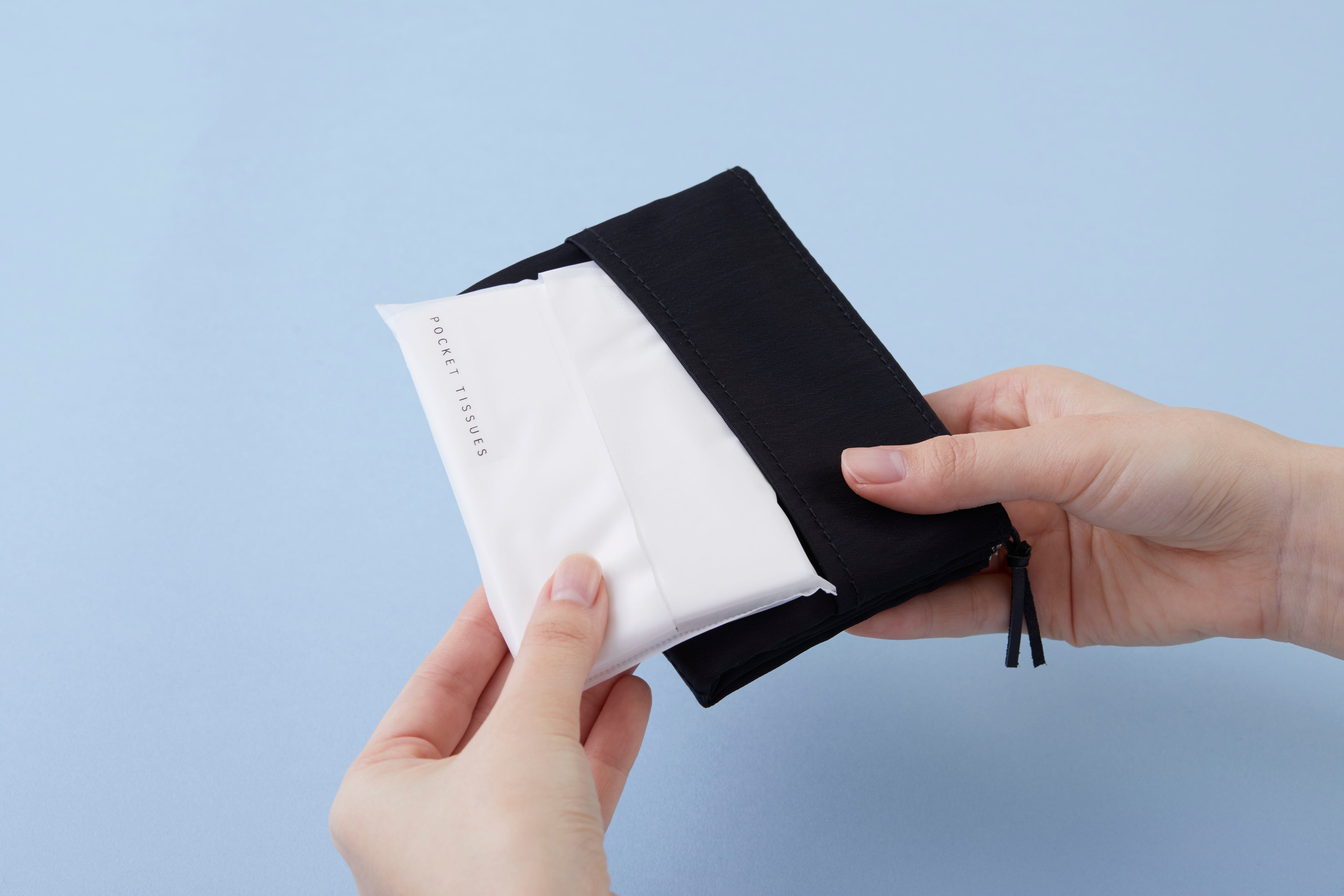 サイズは小物用ポケットがついたスタンダードサイズと、ポケットティッシュケースが付いた二つ折りサイズの2種類で、カラーは人気のくすみカラーを中心としたクロ、カーキ、ピンク、ネイビーの4色展開です。