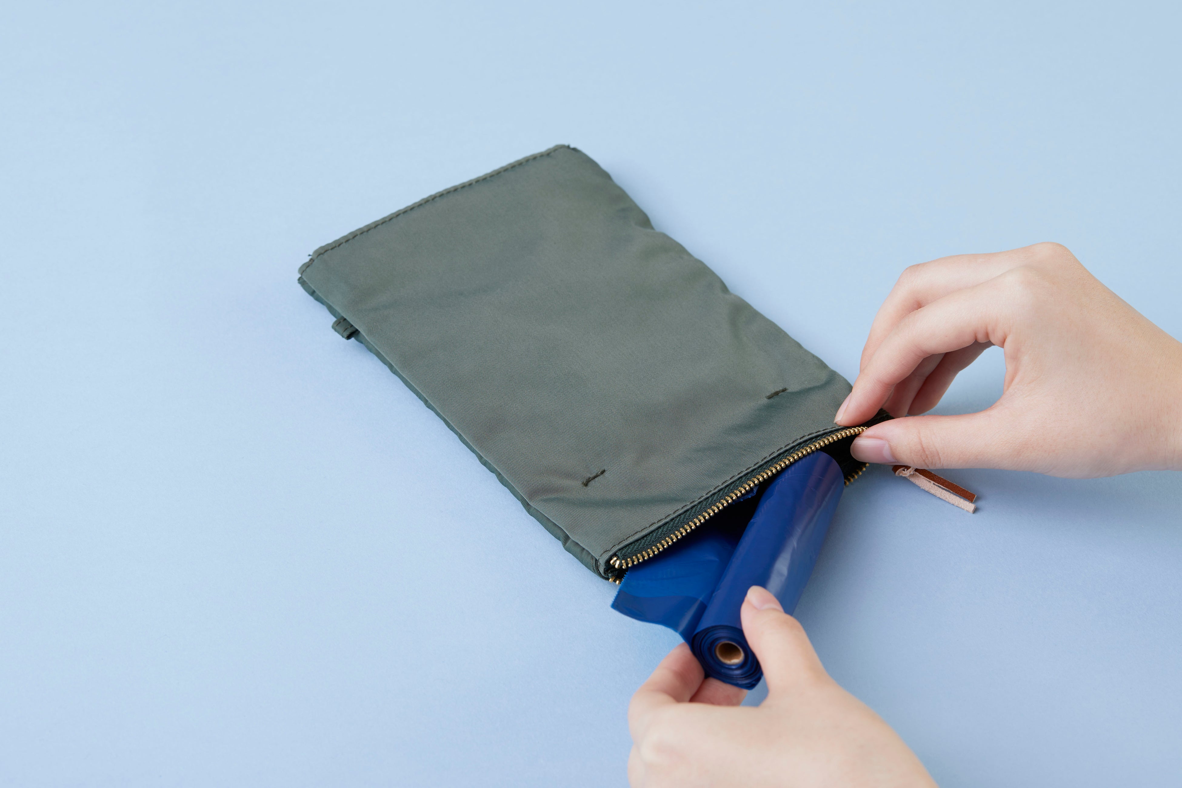 「ホルポ」は、内側に専用のごみ袋がセットできる持ち歩きに便利なポーチ型のごみ入れです。外出先で出るちょっとしたごみを、かばんやポケットを汚さず衛生的に捨てることができます。