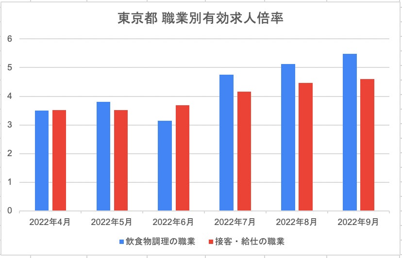 東京都の職業別有効求人倍率を見ると、2022年4月時点の3.5(調理)3.52(接客サービス)から、2022年9月は5.48(調理)4.6(接客サービス)に上昇。