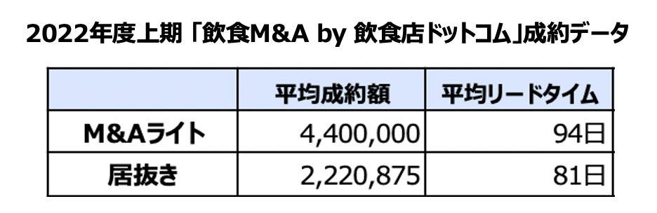 株式会社シンクロ・フード(本社:東京都渋谷区、代表取締役:藤代真一、東証プライム市場:3963)/ 100%子会社 株式会社ウィットは、同社が運営する、居抜き店舗の買取査定サイト「居抜き情報.COM」と飲食店に特化したM&Aサービス「飲食M&A by飲食店ドットコム」において、2022年度上半期の居抜きとM&Aそれぞれ平均の成約額とリードタイムを比較し、どちらが高く売却できるのかを調査しました。