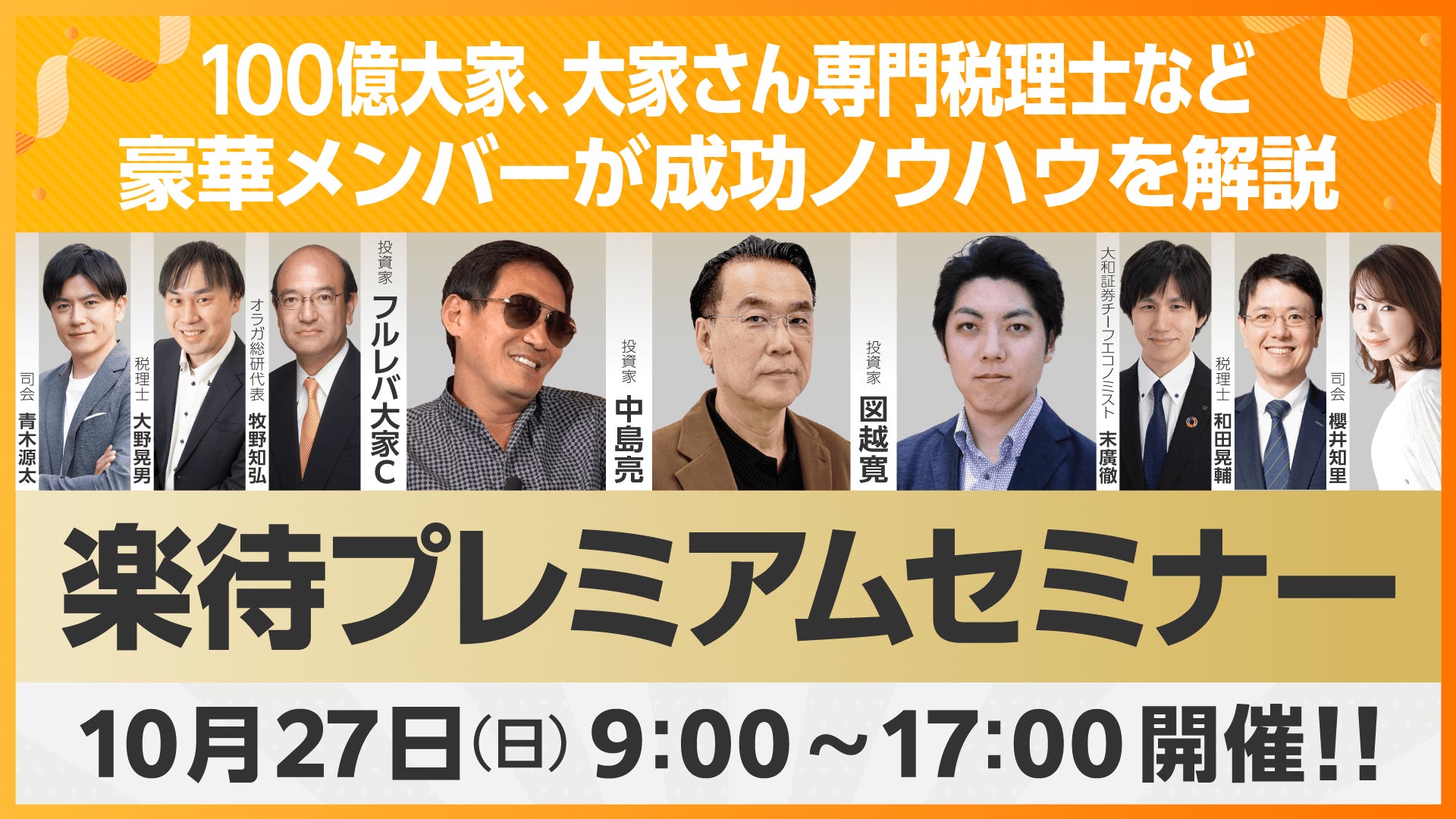 不動産投資歴21年の大家や税理士、経済の専門家など総勢10名超が登壇する「楽待プレミアムセミナー」を10月27日(日)に開催します。司会を務めるのは、元日本テレビアナウンサーの青木源太さんと、元フリーアナウンサーで不動産投資家の櫻井知里さん。最新の投資戦略や金融機関事情、規模拡大で注意すべき税金対策など、不動産投資で成功するための実践ノウハウを「楽待プレミアム会員限定」でお届けします。