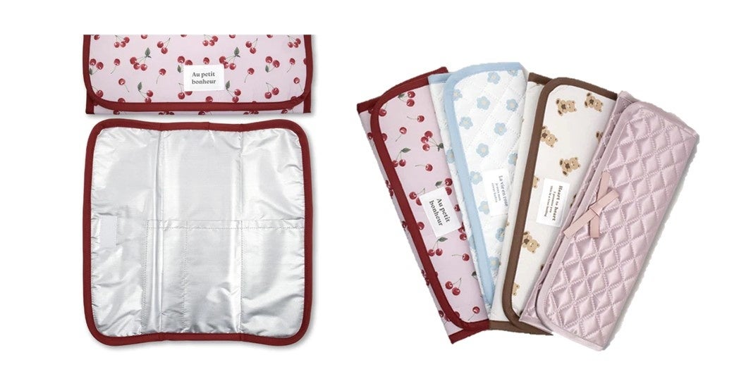 ヘアアイロンはもちろん、アクセサリーやオイルなどのヘアケアアイテムをセットで持ち歩けるケースも販売中です。内側は仕切りポケット付きのため、安全に収納可能です。さくらんぼ・くま・フラワー・リボンのガーリーデザイン4種で展開しています。