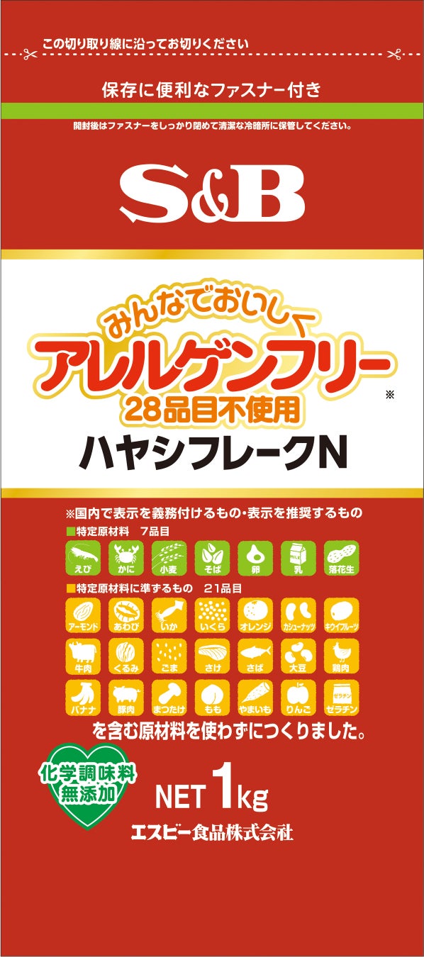 エスビー食品株式会社は、学校給食向けの業務用アレルゲンフリーフレークシリーズより「アレルゲンフリー(28品目不使用)ハヤシフレークN1kg」を新発売します。
