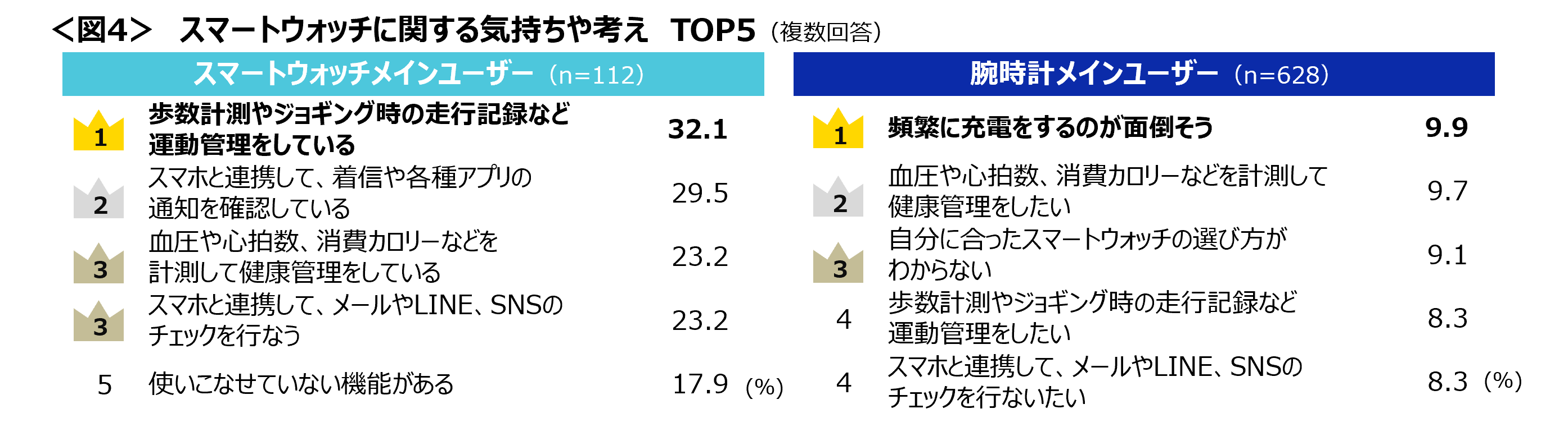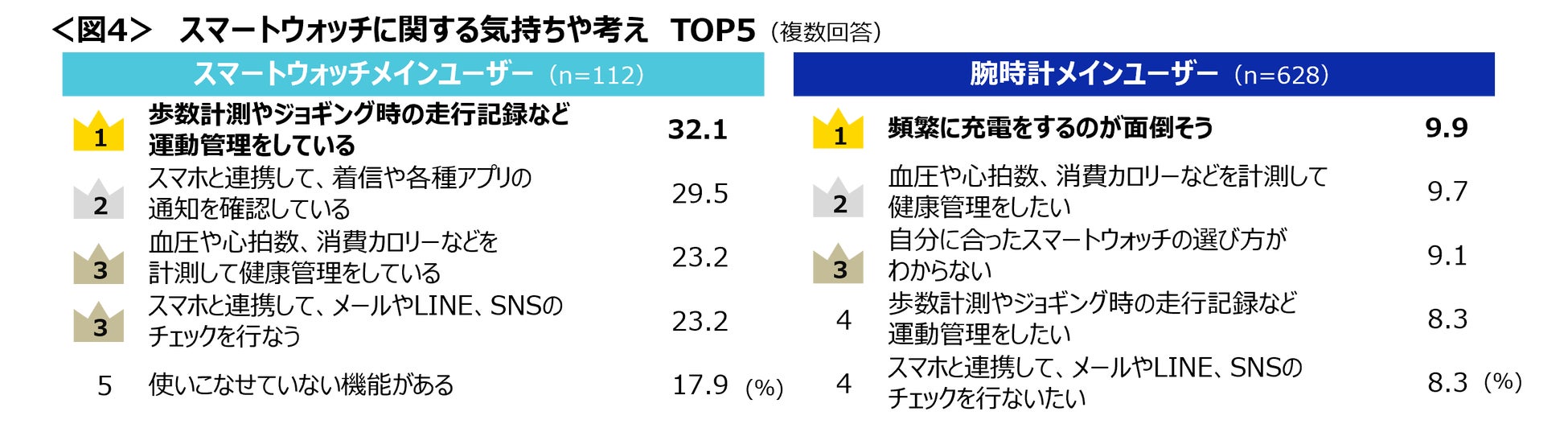スマートウォッチに関する気持ちや考えは、メインユーザーでは「走行記録など運動管理」「スマホと連携して、着信や各種アプリの通知を確認」がTOP2。「使いこなせていない機能がある」も17.9%。<図4>