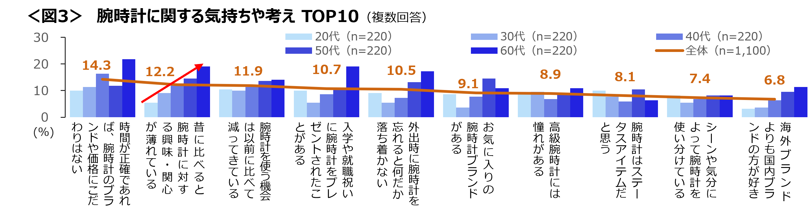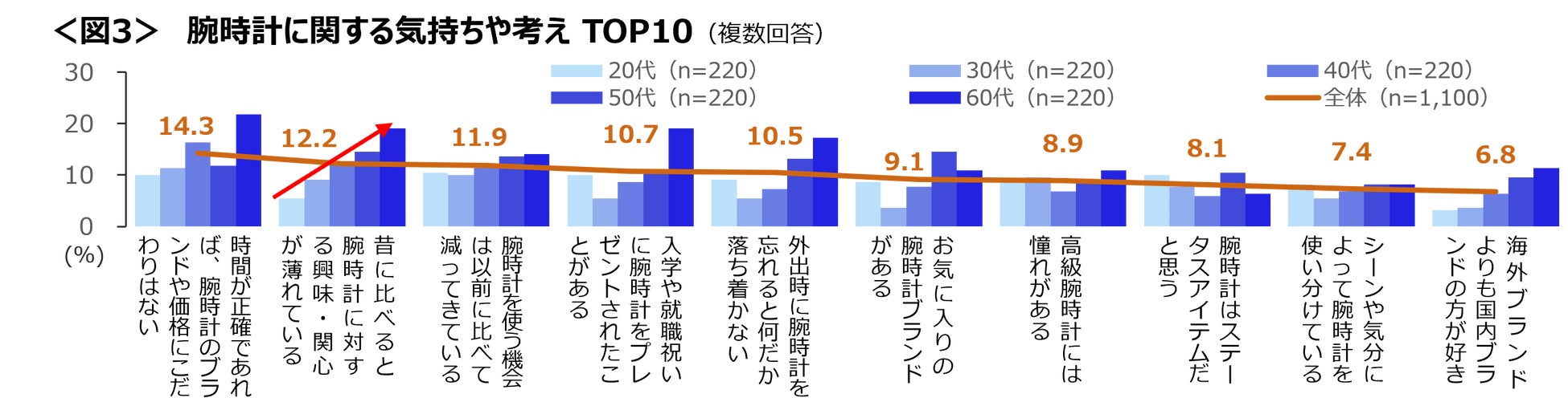 年代が高くなるほど「腕時計に対する興味・関心が薄れている」という意識も高まっている。<図3>