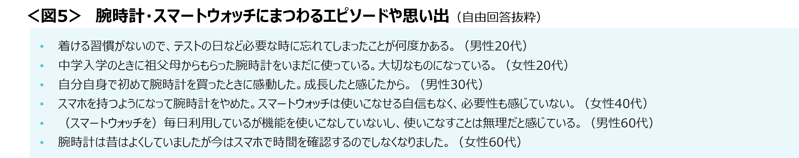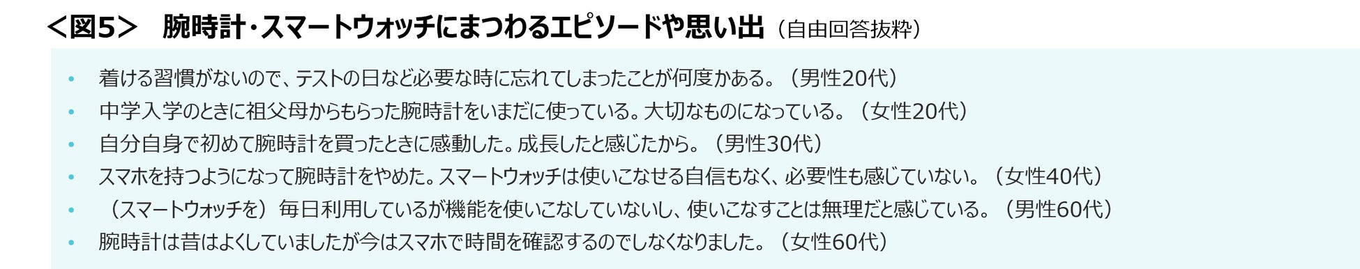 思い出・エピソードとしては、「お祝いや記念日に購入した(してもらった)」といった購入やプレゼントにまつわるコメントが多くみられた。また使用頻度減少の理由として「スマートフォンで代用できる」という声も少なくなかった。<図5>