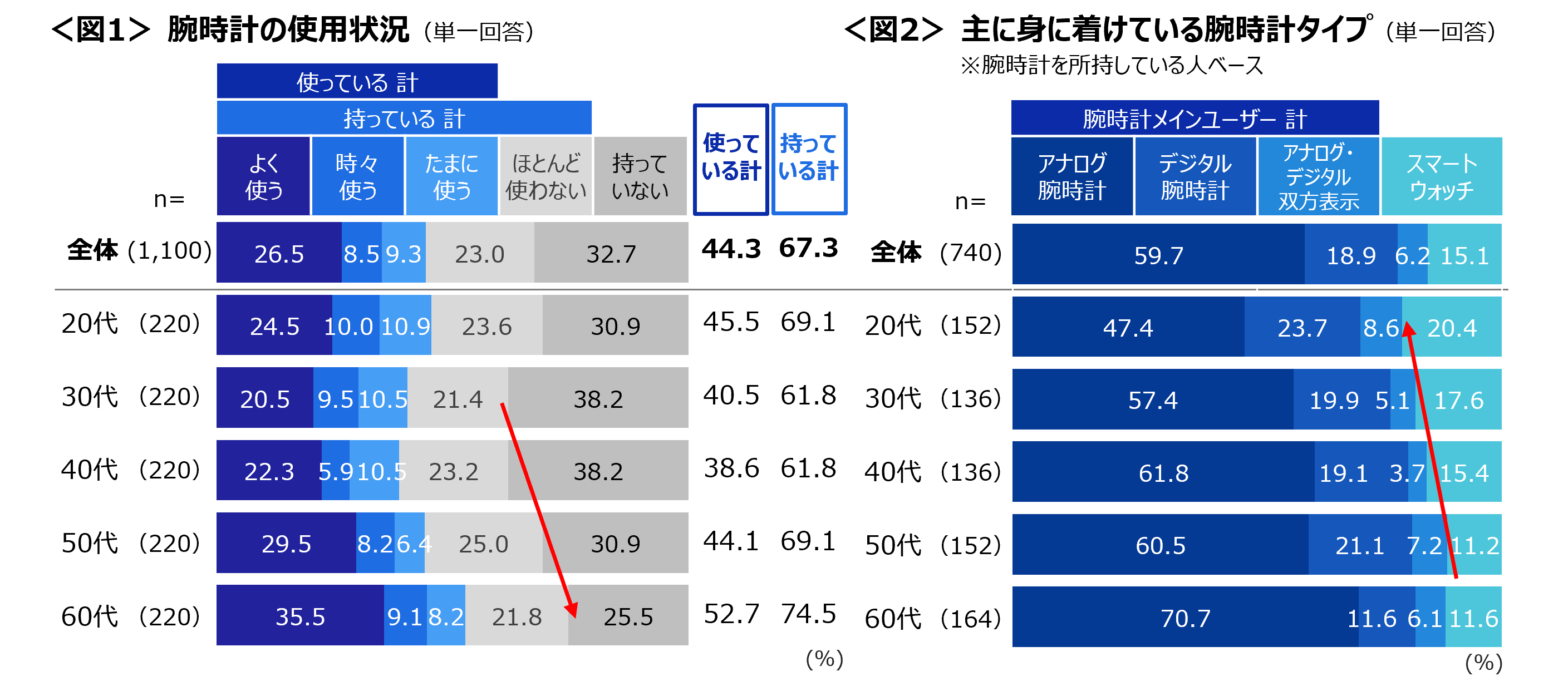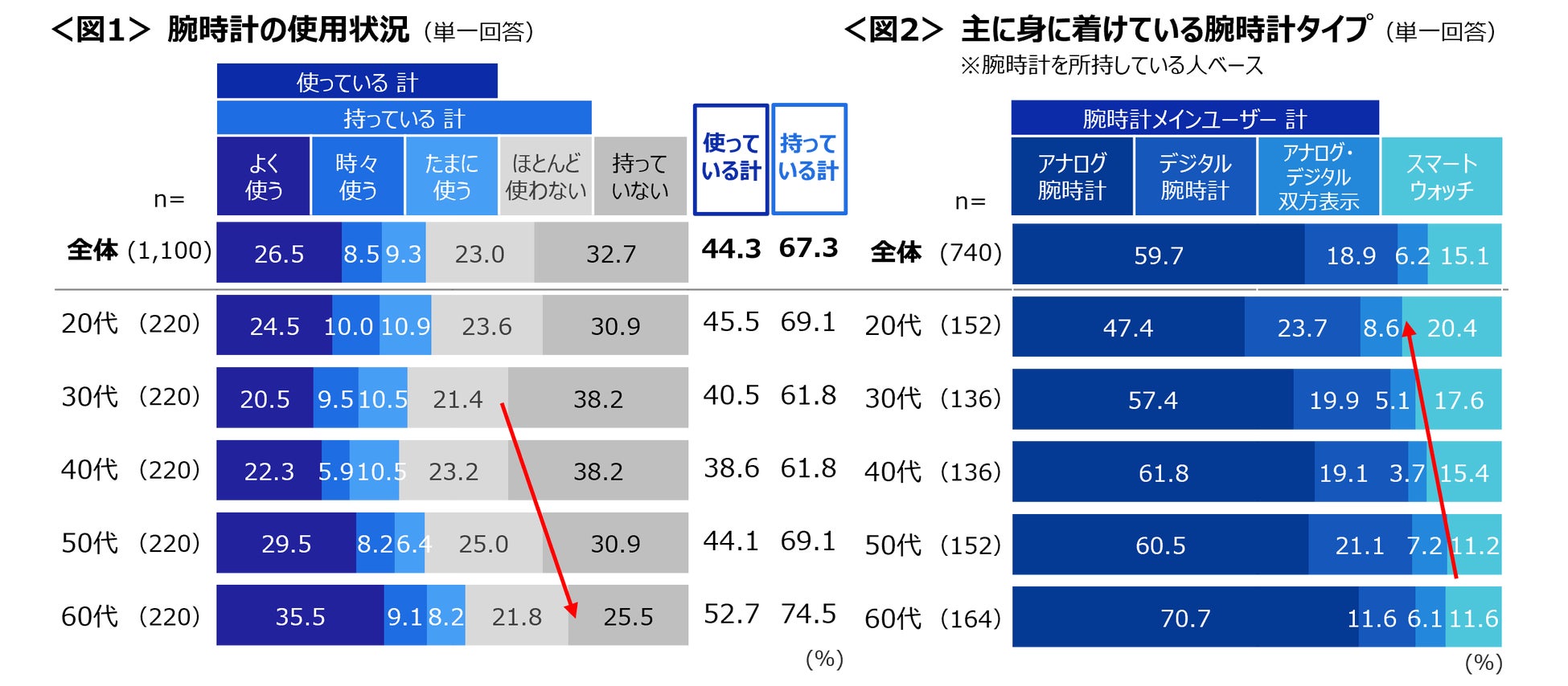 腕時計またはスマートウォッチを持っている人は67.3%、普段使っている人は44.3%。