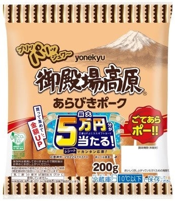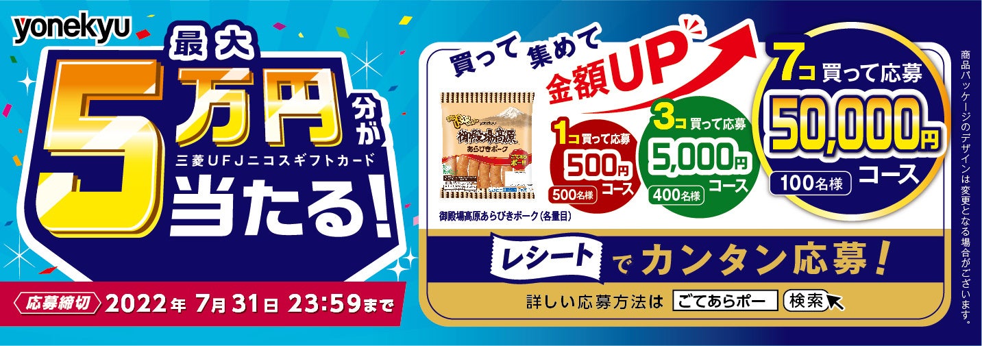 米久株式会社(静岡県沼津市)は、2022年4月26日から2022年7月31日まで、「御殿場高原あらびきポーク」(愛称:ごてあらポー‼)のご愛顧への感謝として「最大5万円分のギフトカードが当たる!ごてあらポー‼キャンペーン※1」を実施します。
