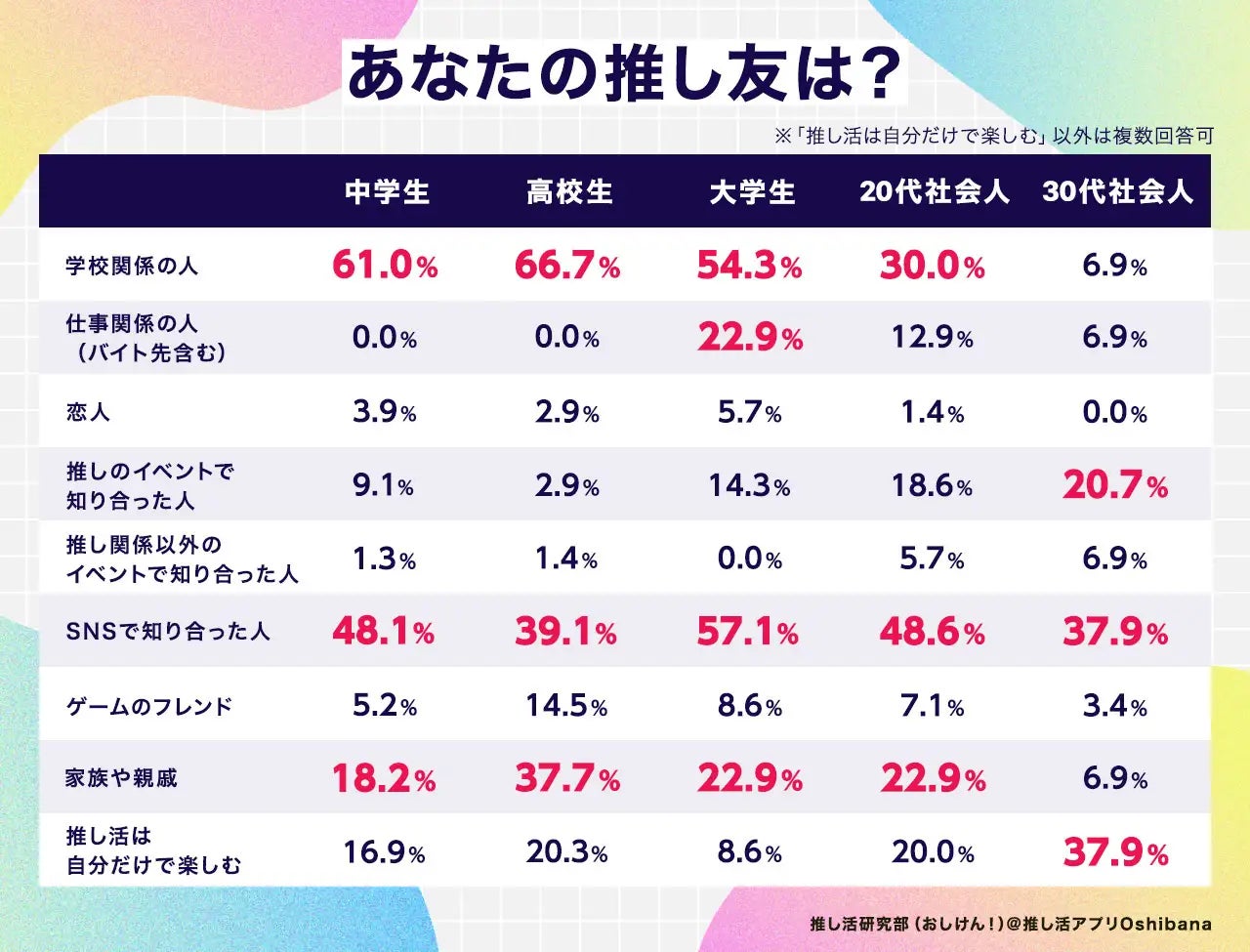 「推し活」を一緒に楽しむ相手「推し友」を調査するアンケートでは、中高生の多くが「学校関係の人」を挙げました。「学校関係の人」とは、現在通っている学校での友人や、かつて通っていた学校での友人も含みます。