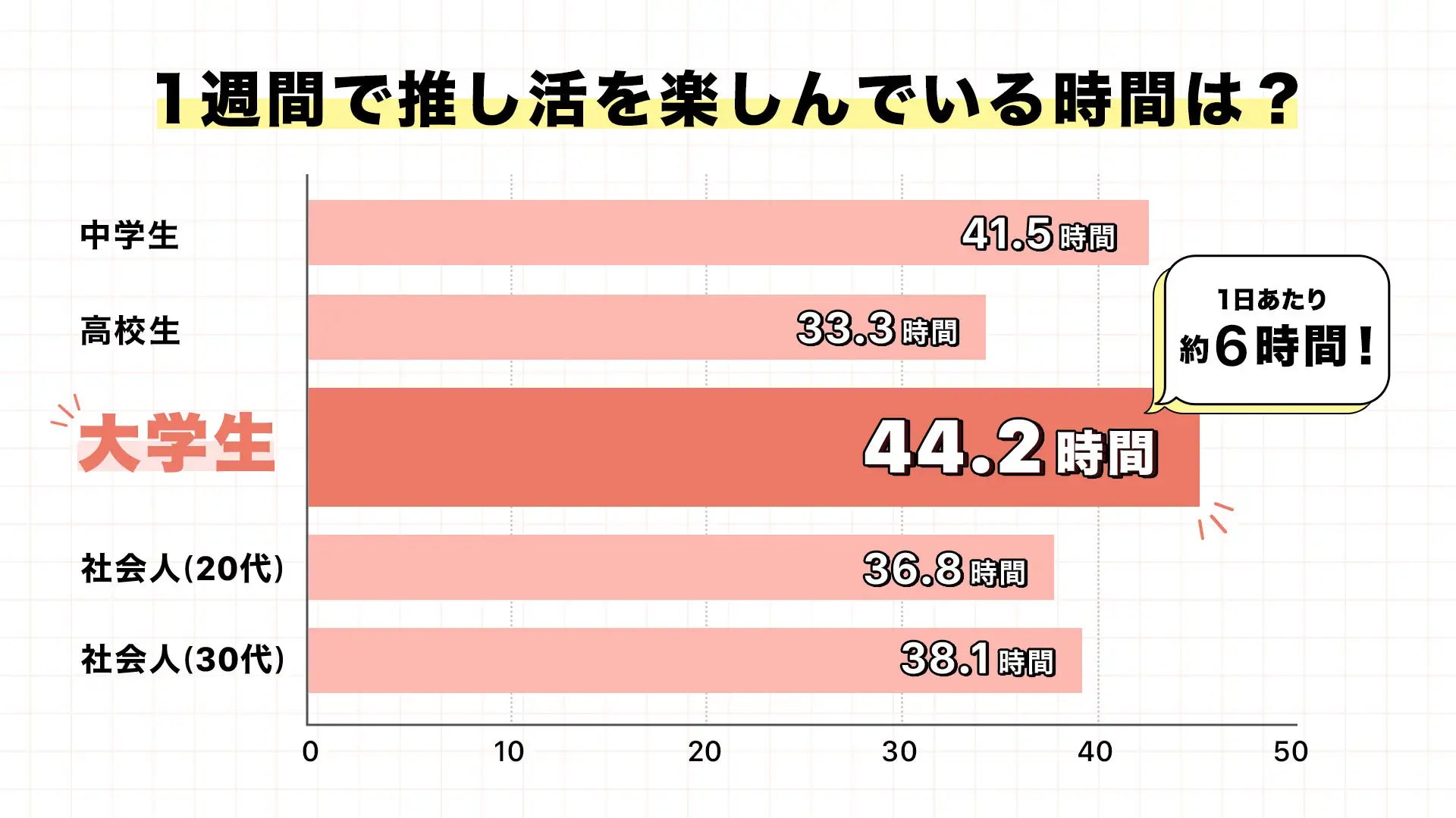 年代別に1週間の推し活を楽しむ時間を聞いた調査では、推し活時間を最も楽しんでいるのは大学生でした。44.2時間とぶっちぎりで高く、平均で1日に約6時間は推し活にかけている計算になります。