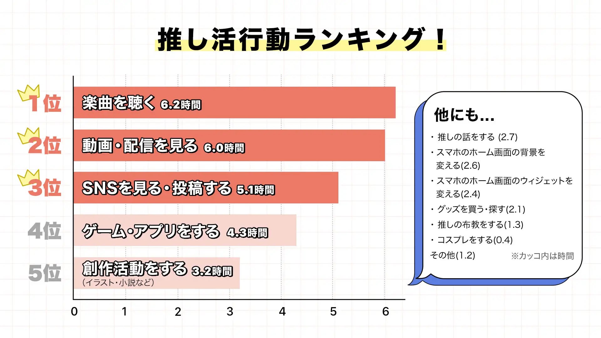 1週間の推し活時間は平均36.2時間 中学生の推し活は「推しの動画・配信を見る」が一番に