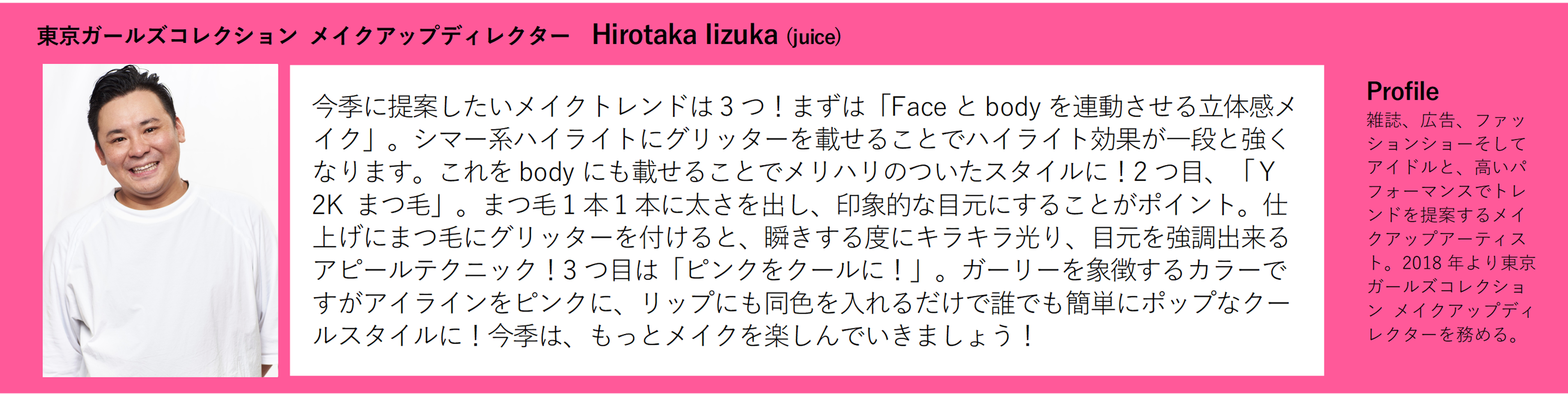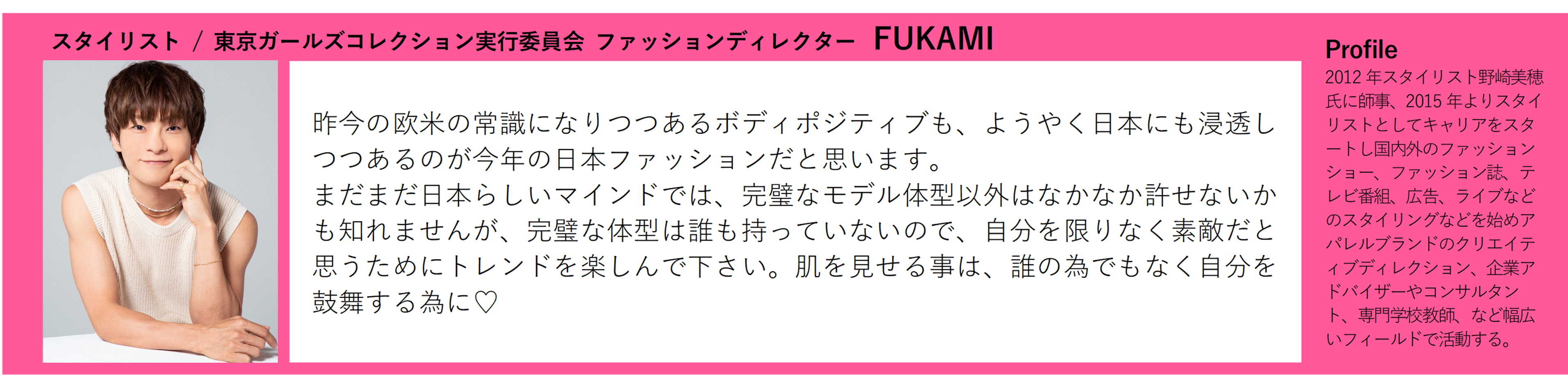 | ブランド:aerie By American Eagle、AMERICAN EAGLE、badmood、F i.n.t、FARFETCH、lanan、moment+、Primaras、RAGEBLUE、RESEXXY、SHEIN、SHEL'TTER、Treat ürself、WEGO、X-girl ※アルファベット順 メインモデル:新木優子、アリアナさくら、安斉星来、あんな、池田美優、石川恋、入江美沙希、江野沢愛美、大峰ユリホ、岡崎紗絵、岡本夏美、楓、香川沙耶、景井ひな、加藤栞、加藤ナナ、香音、茅島みずき、川口ゆりな、久間田琳加、小宮山莉渚、小室安未、紺野彩夏、雑賀カアネ、雑賀サクラ、桜井美悠、サクラ・キルシュ、鈴木愛理、せいら、髙橋ひかる、武田玲奈、田鍋梨々花、鶴嶋乃愛、出口夏希、Taeri、トラウデン直美、中条あやみ、永瀬莉子、那須ほほみ、菜波、浪花ほのか、新沼凛空、Niki、生見愛瑠、橋本萌花、土方エミリ、藤井夏恋、藤井サチ、藤田ニコル、ブリッジマン遊七、ほのか、マギー、松井愛莉、村上愛花、村瀬紗英、山本舞香、ゆうちゃみ、吉木千沙都、吉田莉々加 他 ※50音順 モデル:かとみか、椎名亜美、みりちゃむ、ゆいちゃみ 他 ※50音順 ゲスト:一ノ瀬颯、井上想良、王林、翔、芹名、綱啓永、とうあ、冨永章胤、中町兄妹、なこなこカップル、八村倫太郎、バンダリ亜砂也、福原遥、前田拳太郎、丸山礼、水沢林太郎、山下幸輝、ゆりいちちゃんねる、よしあき&ミチ、四千頭身 他 ※50音順 メインアーティスト:&TEAM、SKY-HI、Da-iCE、NewJeans、BE:FIRST 他 ※50音順 オープニングアクト:sherbet、ZILLION、FRUITS ZIPPER、MISS MERCY、LIL LEAGUE ※50音順 MC:EXIT、鷲見玲奈 ※50音順 オフィシャルサポーター:広海・深海 ステージ内容: ファッションショー、アーティストライブ、パートナーステージ 他 主催: 東京ガールズコレクション実行委員会 特別協賛: 株式会社マイナビ パートナー:イオンカード(イオンクレジットサービス株式会社)、UMAJO(JRA)、ダイソン ヘアケア(ダイソン株式会社) 、Up-T(丸井織物株式会社)、キッコーマン いつでも新鮮 しぼりたて生しょうゆ(キッコーマン食品株式会社)、ダイソー(株式会社大創産業)、Lemon8(Lemon8 Japan)、アパガード(株式会社サンギ)、エリス(大王製紙株式会社)、ニキパ ハイドロパッチ プレミアム(株式会社キンカン)、 法テラス(日本司法支援センター)、PAS(ヤマハ発動機販売株式会社) 他 ※ランク別、50音順 ビューティーパートナー:SBC湘南美容クリニック(SBCメディカルグループ)、BELLE SERIES(2FLAG株式会社)サステナビリティパートナー:ハバリーズ(株式会社ハバリーズ) 後援:渋谷区、国連の友Asia-Pacific 協力:IMAGICA EEX 他 公式メディア:girlswalker 演出:DRUMCAN 企画/制作:株式会社W TOKYO |