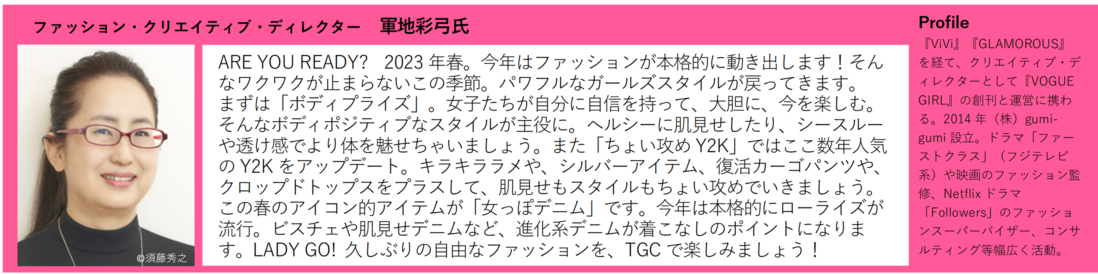 【マイナビ TGC 2023 S/S】TGCが発信する2023春夏のトレンドテーマは『LADY GO!』提案するキーワードは3つ!「ボディプライズ」「ちょい攻めY2K」「女っぽデニムスタイル」