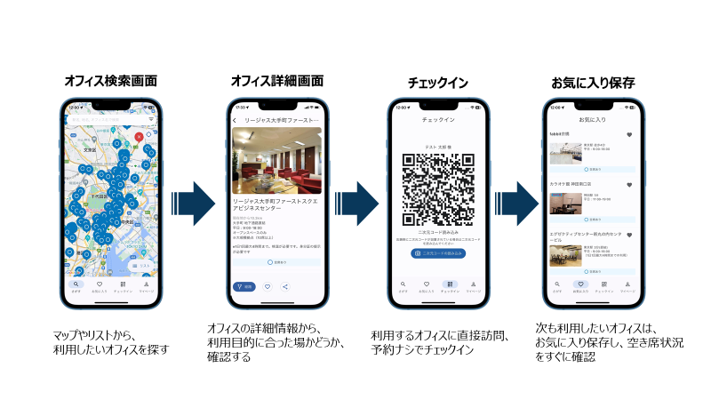 ユーザーは提携店舗の中からその都度オフィスを選択し、チェックイン(入店手続き)をすることで店舗を利用できます。