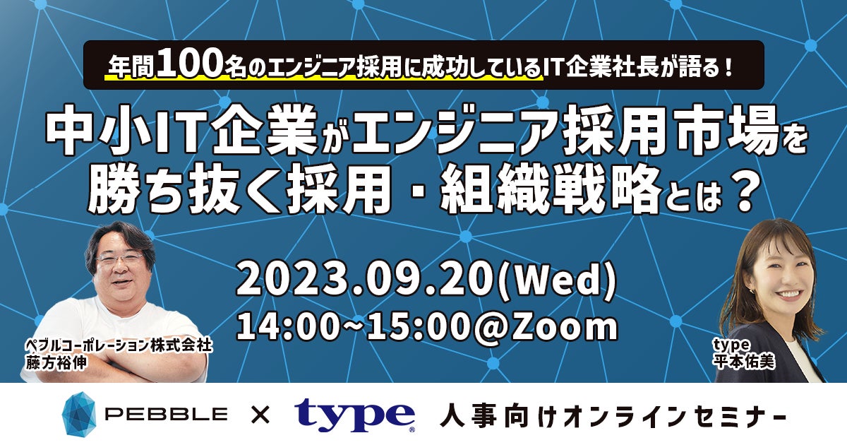 転職サイト「type」では、9/20(水)14時より「年間100名のエンジニア採用に成功しているIT企業社長が語る!中小IT企業がエンジニア採用市場を勝ち抜く採用・組織戦略とは?」を開催いたします。