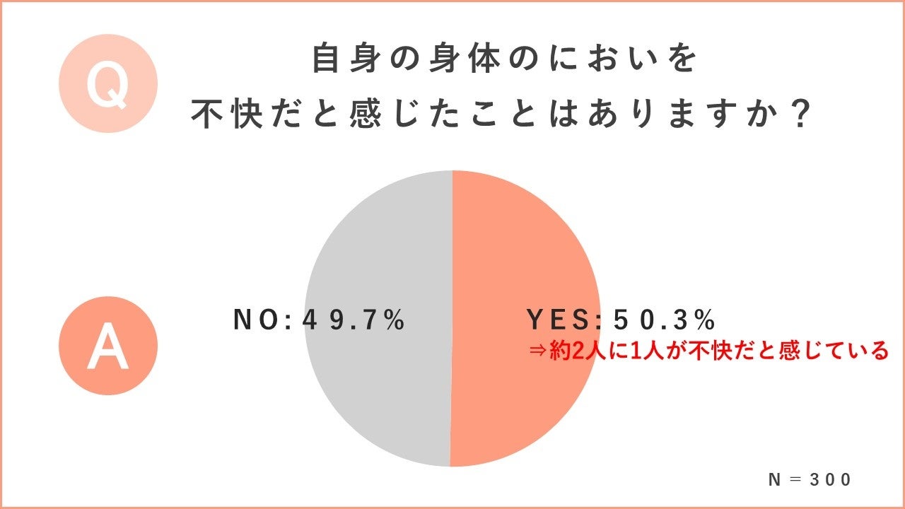 夏は体臭の発生が気になる季節ですが、最近はにおいが原因で周囲に不快感を与えるスメルハラスメント(通称:スメハラ)が話題になることも。今回女性300人に調査をしたところ、自身の身体のにおいが不快だと感じている女性は約半数で、2人に1人は体臭を気にしているということがわかりました。