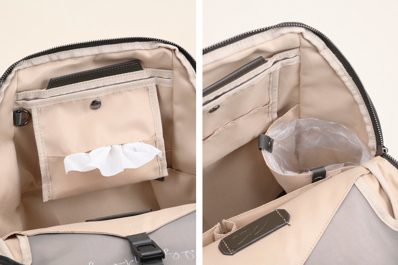 子供の鼻をかむなど、必要な時にすぐ見つけることができる「ティッシュポケット」と、ビニール素材でお手入れしやすい「簡易ゴミスペース」。さらに、2024モデルではビニール袋を拡げて固定できるスナップボタンを内装に追加。よりスムーズにゴミを入れられるようになりました。